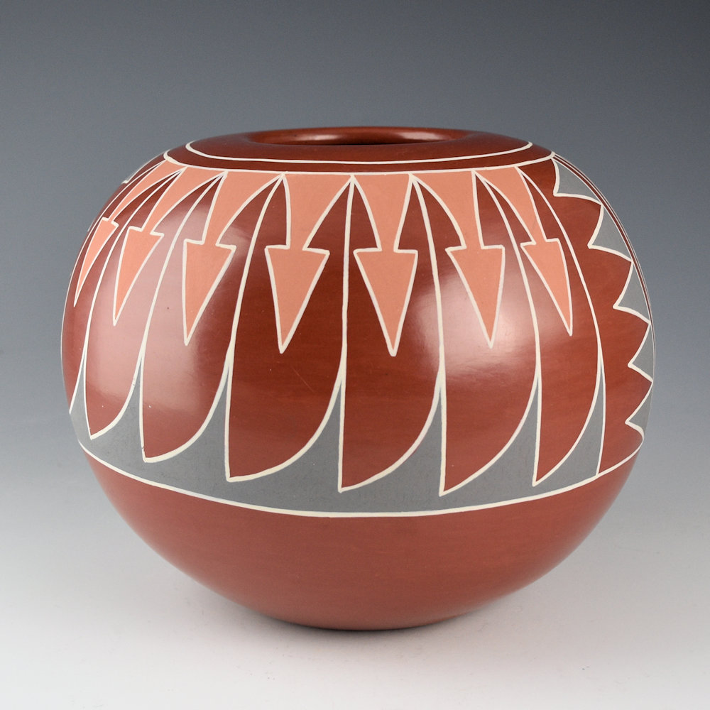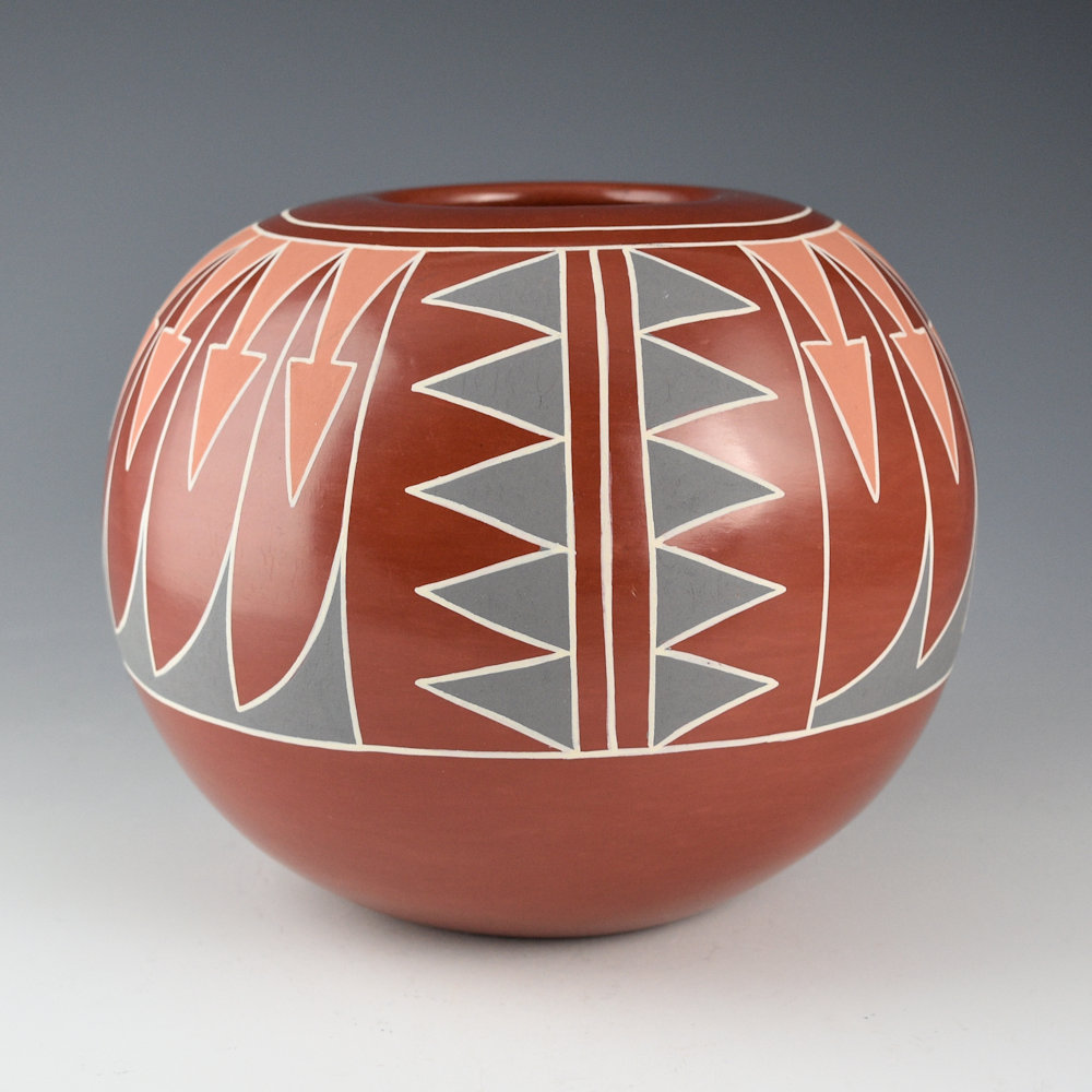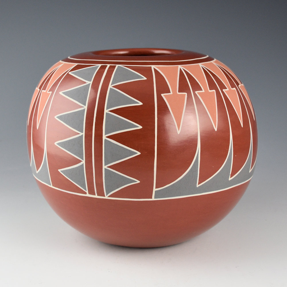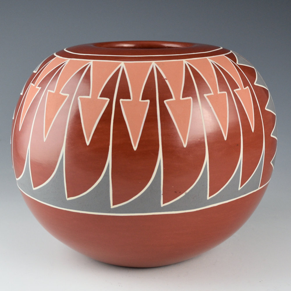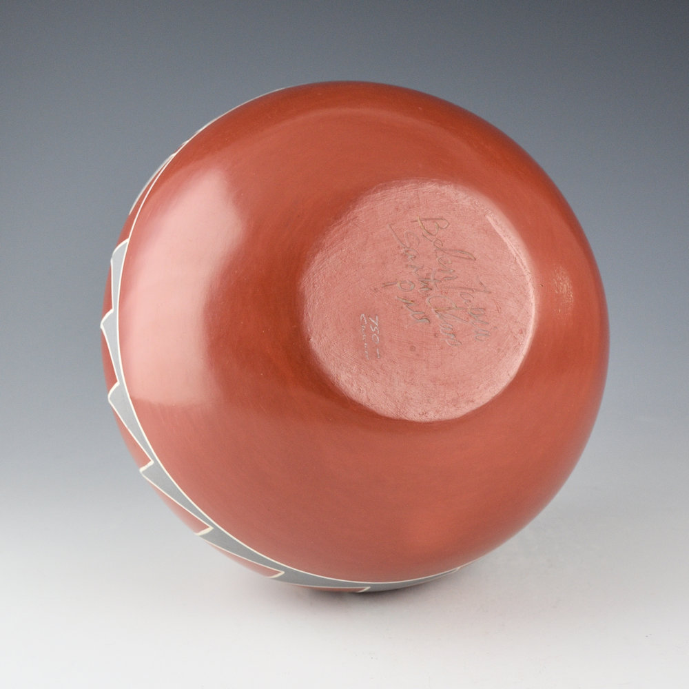 Belen Tapia was a daughter of Tomas and Maria Tafoya. She was a niece of SaraFina Tafoya and a sister of Ramoncita Sisneros and the mother of Anita Suazo, Frank Tapia, and Anna Archuleta. She began making pottery in the 1930s during the early years of Santa Clara polychrome pottery. However, by the 1950's she was making primarily carved pottery with unique designs and forms. By the 1980's she was again making polychrome pottery, bringing her artistry full circle. Both of these pieces are from the 1980's. They are each highly polished with a red surface and then painted with various clay slips. The colors; peach, blue, ochre, and white are all natural clay slips.