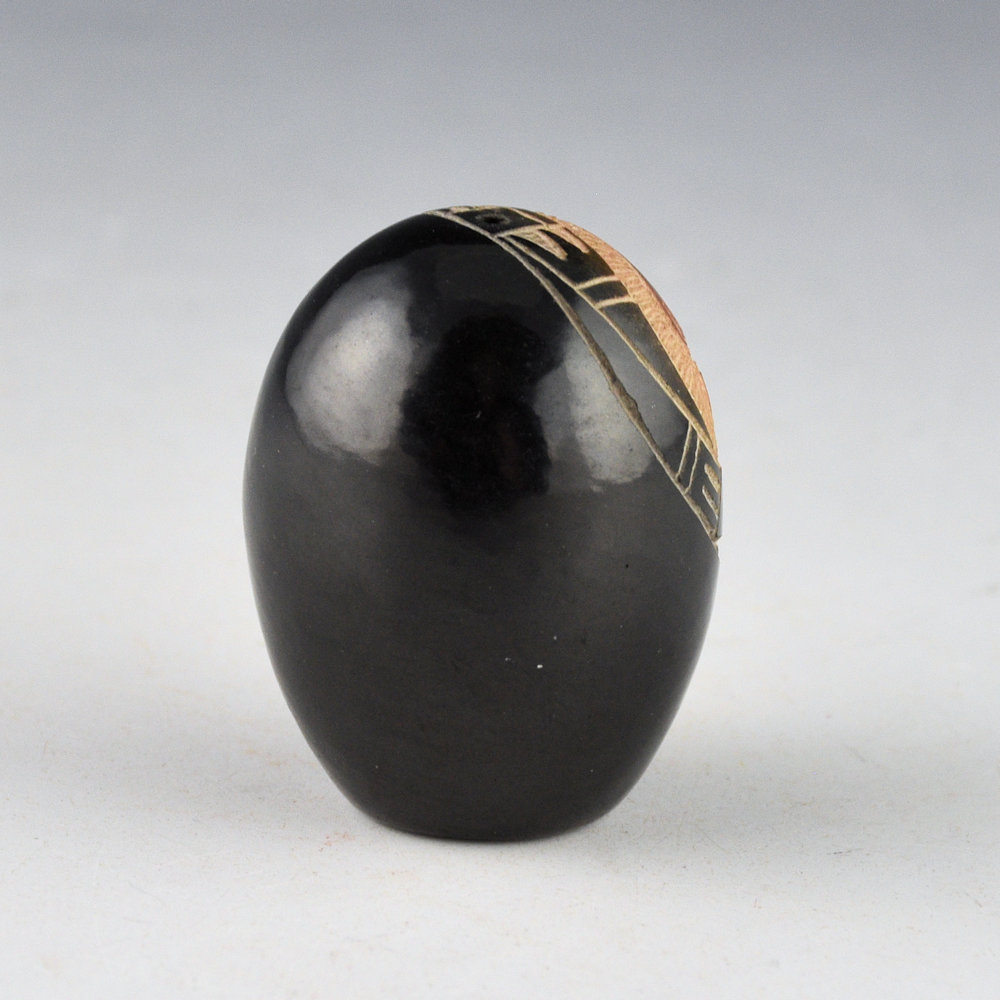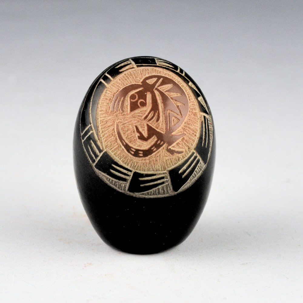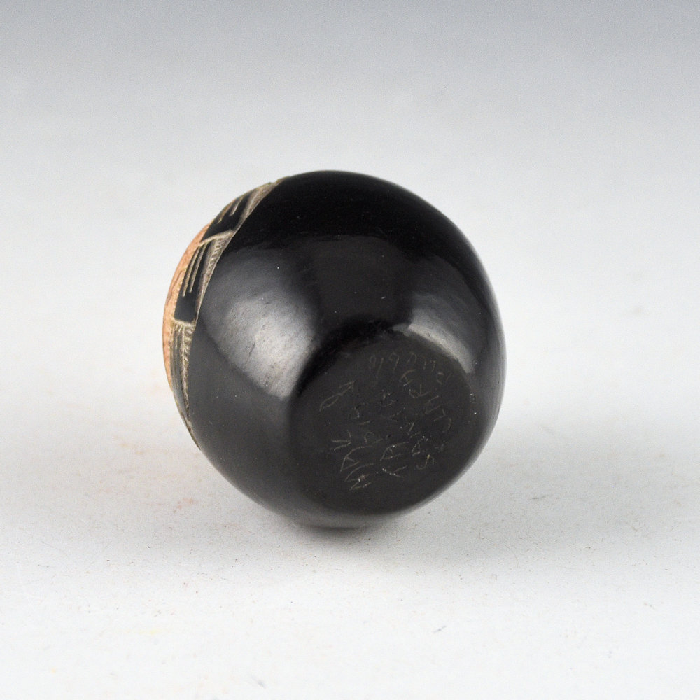 Mae Tapia was known for her intricately etched miniature pottery. She was a daughter of potters Joe and Santanita Suazo.  Her sisters include Martha Suazo (the wife of Art Cody Haungooah), Margie Naranjo, Candelaria Suazo, and Shirley Duran.  This seedpot is coil-built and fully polished.  It is etched with a Mimbres lizard on one side.  The lizard is surrounded by geometric designs.  After it was fired black, the lizard was two-toned sienna.  The piece is signed on the bottom, “Mae Tapia”.  It is in excellent condition with no chips, cracks, restoration, or repair.