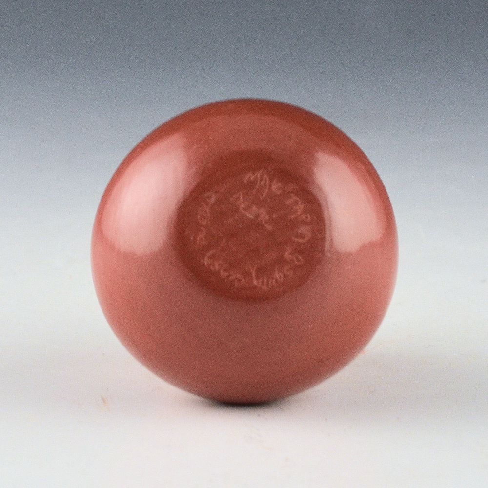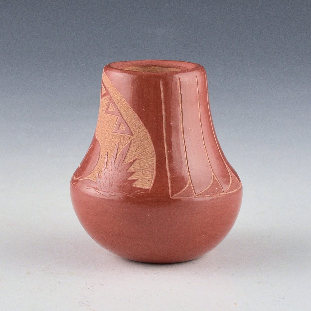 Mae Tapia was known for her intricately etched miniature pottery. She was a daughter of potters Joe and Santanita Suazo. Her sisters include Martha Suazo (the wife of Art Cody Haungooah), Margie Naranjo, Candelaria Suazo, and Shirley Duran. This is a larger piece of her pottery. It is fully polished and in the shape of a water jar. There is a realistic deer on one side and etched feathers on the other side of the jar. The piece was traditionally fired red. It is signed on the bottom, “Mae Tapia”. It is in excellent condition with no chips, cracks, restoration, or repair.