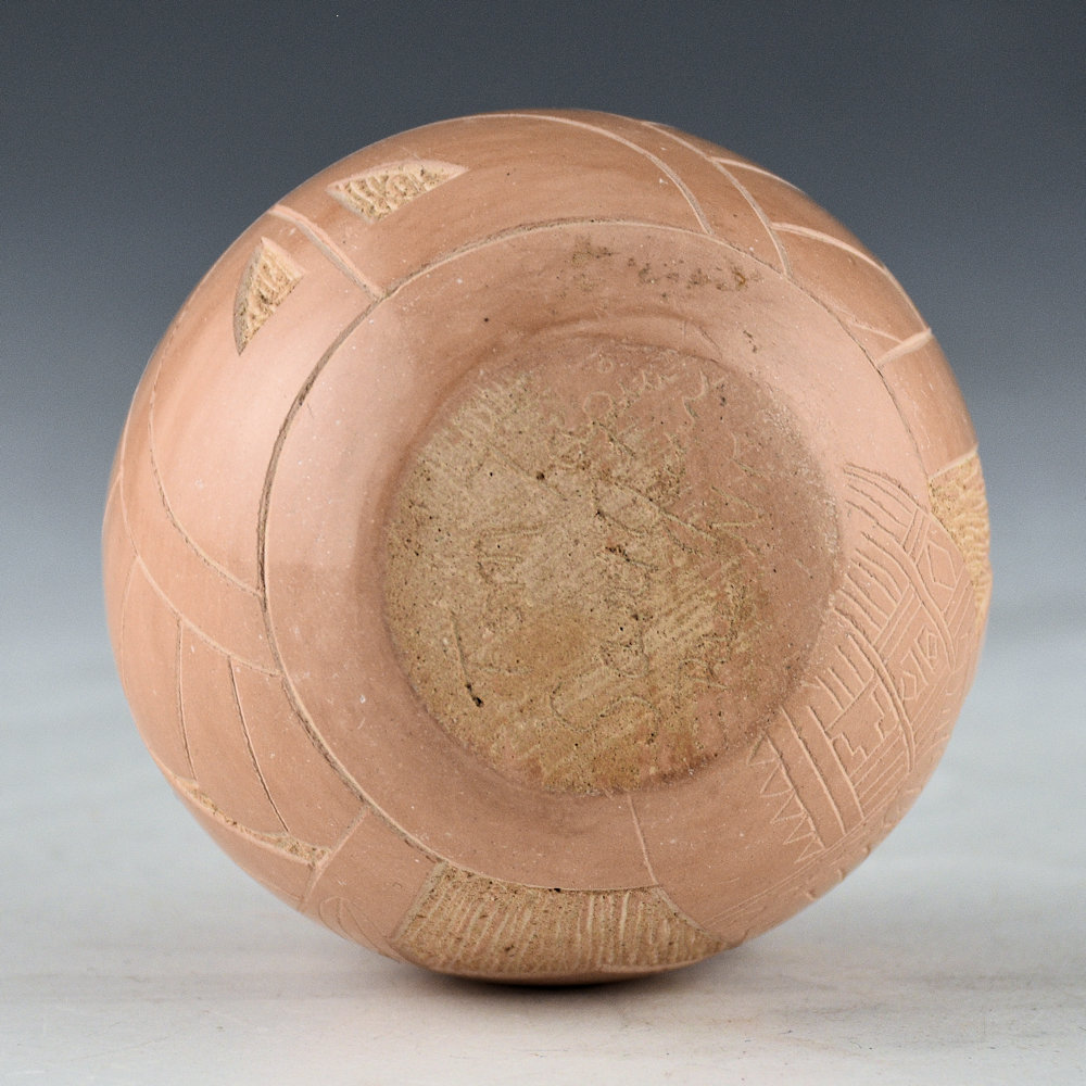 This is an intricately designed seedpot by Tom Tapia. The seepdot is fully polished tan, the natural color of the clay. One side has a Tewa Sun, the other a Heote Katsina. Separating them are stylized birds. This is the only piece I’ve seen by Tom in this coloration. Polishing tan is difficult, so it might be why he didn’t do very many. The piece was traditionally fired. It is signed, “Tom Tapia”. It is in excellent condition with no chips, cracks, restoration or repair.