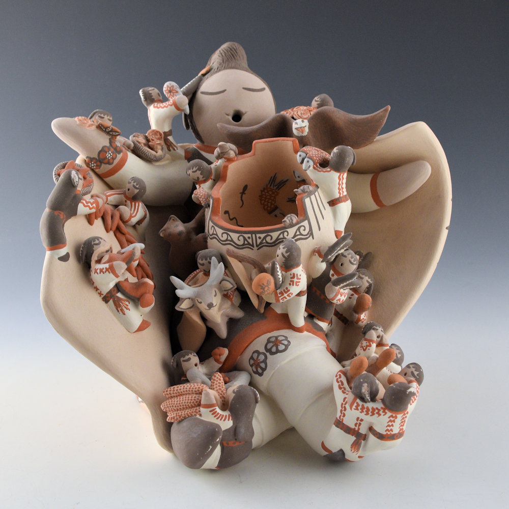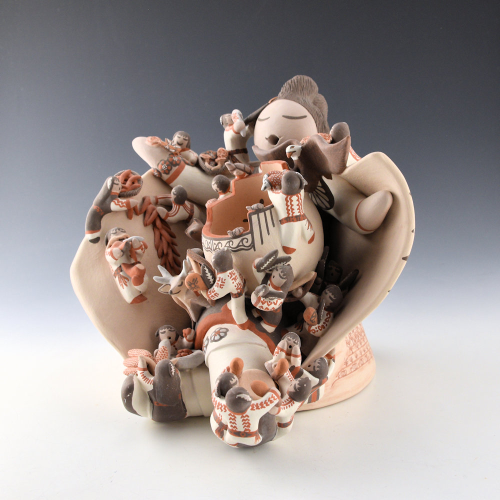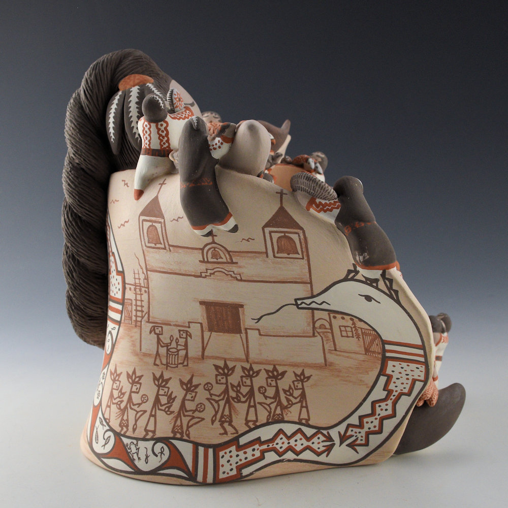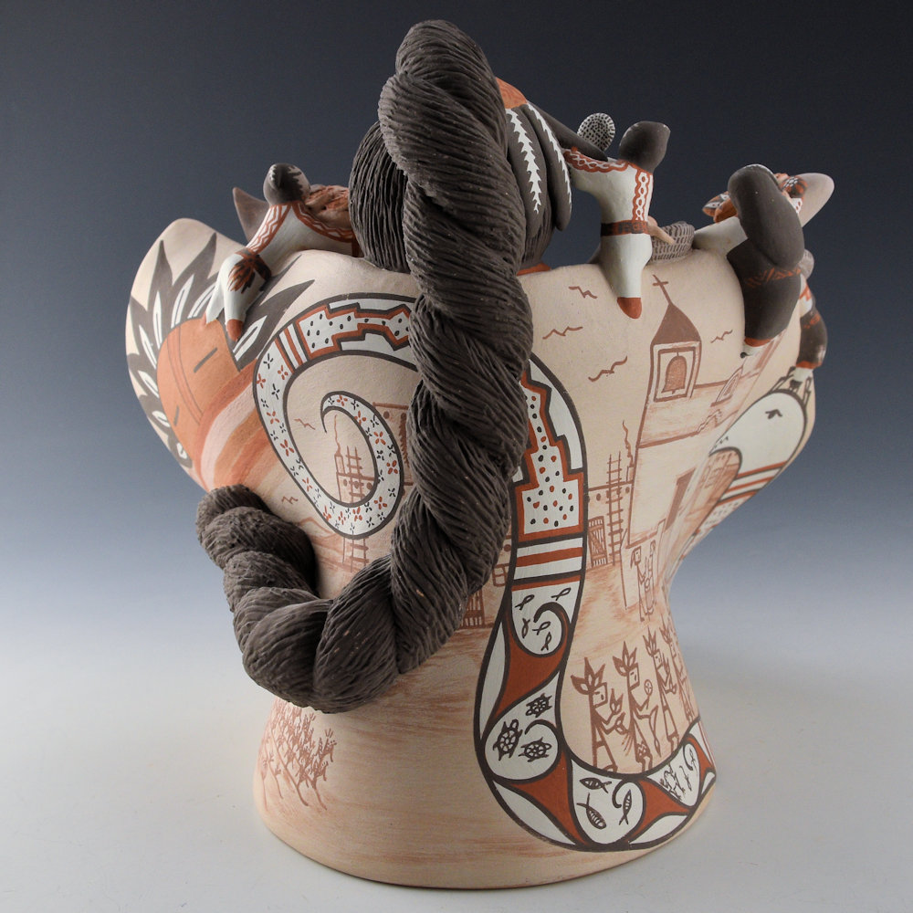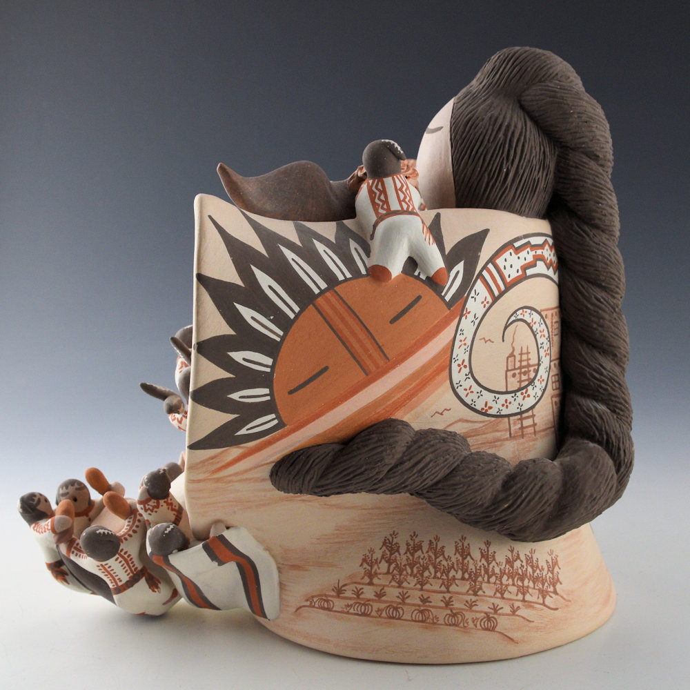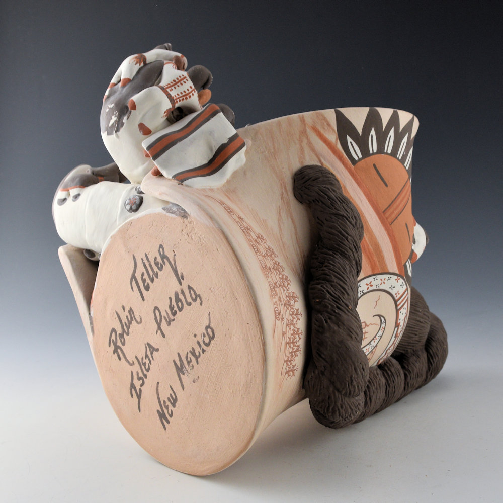 WOW! This is a spectacular large storyteller by Robin Teller (b. 1954) is a daughter of noted potter Stella Teller. This is one of her classic storyteller figures. Her pieces were always creative in the stories they told. This piece is one of her few “Mother Nature” Storytellers. Robin did not make a lot of these pieces as they were so complex and the largest scale of her pottery. Here, “Mother Nature” has a pueble style hair dress. There are 18 children, each with different animals. There are fish, deer, bears, and eagle, and more. The children are also holding rattles or a drum. Do you see the children who are giving her boquets of roses!!? On the shawl of the storyteller there is the church at Isleta Pueblo. In front of the church are the corn dancers. Surrounding the dancers is an avanyu, representing the Rio Grande river that runs by Isleta Pueblo. The opposite side of the shawl has a corn and squash field, along with a rising Sun. Mother nature is also holding a Kiva bowl, the inside of which is meant to represent a lake. Inside the bowl are fish, clams, and other aquatic life. The entire pieces is not just fully designed and painted with clay slips, but also interactive, telling a story about the world around us and how we interact with nature and culture. Robin was always masterful at this figurative storytelling! The piece is painted with native clay slips. The storyteller signed on the bottom, “Robin Teller”. It is in very good condition with no chips, cracks, restoration or repair.