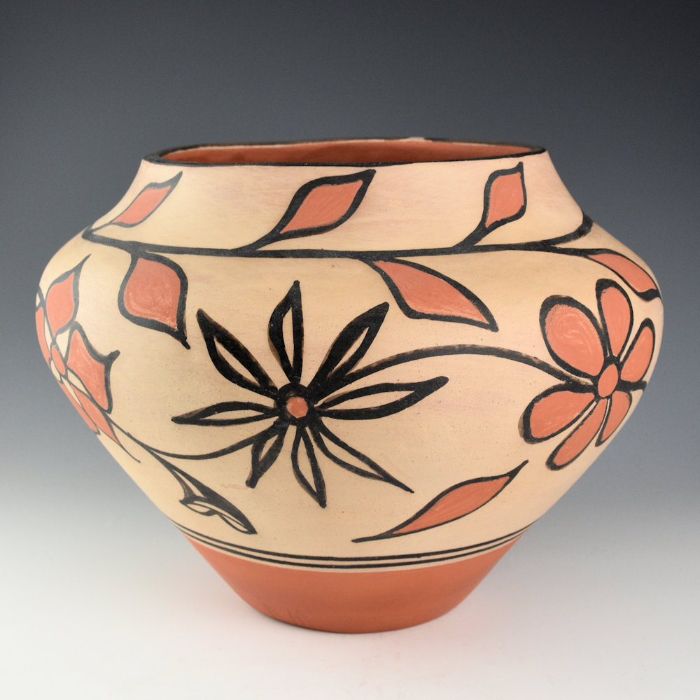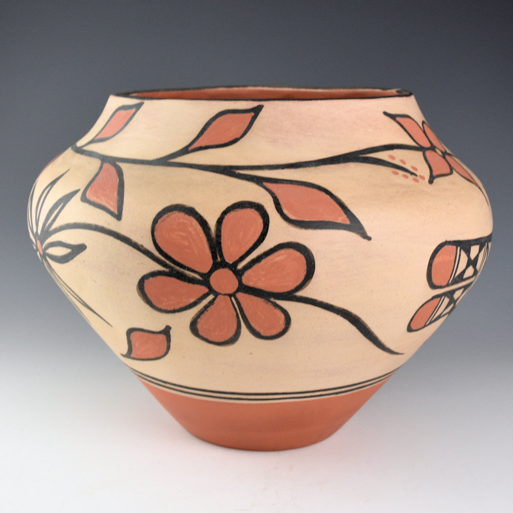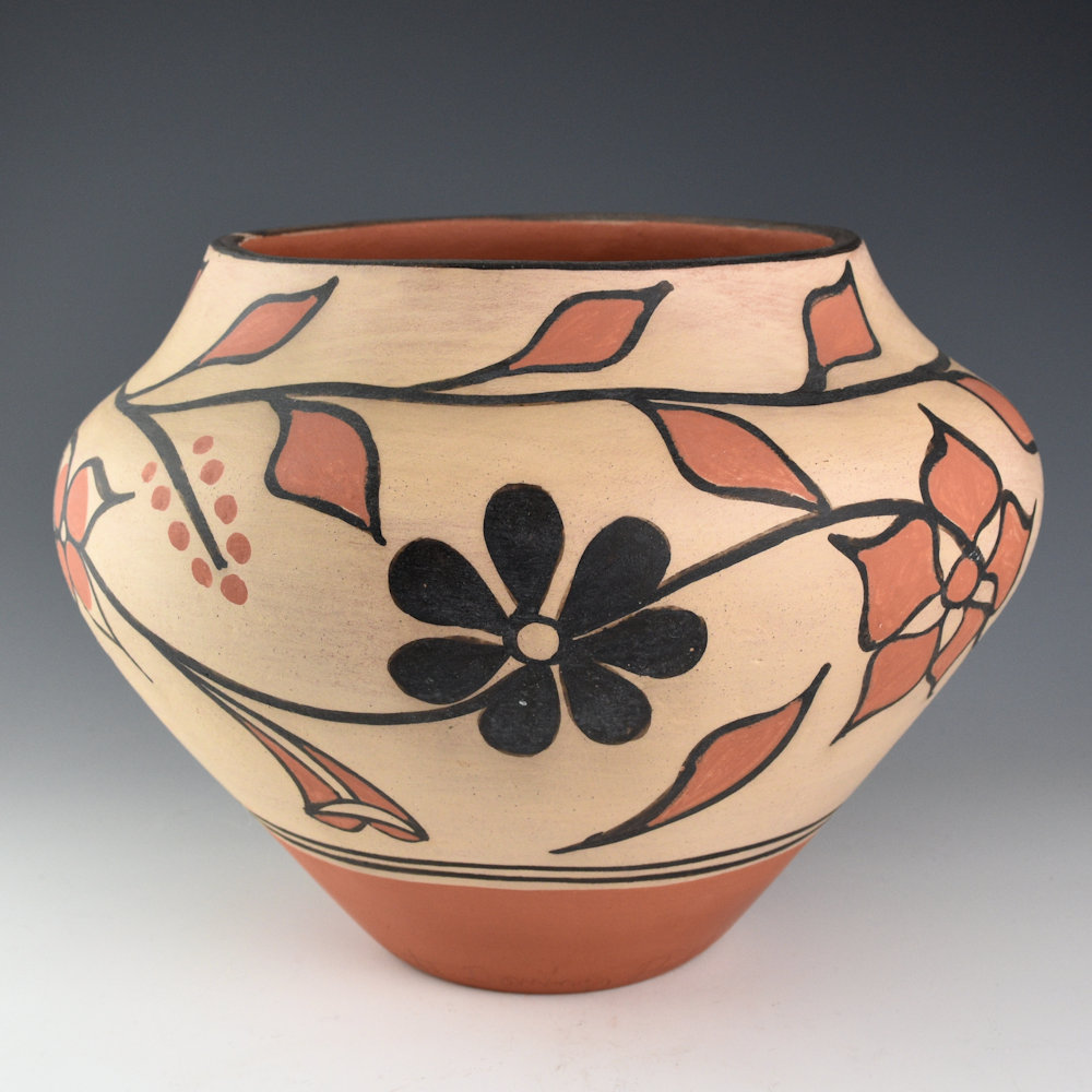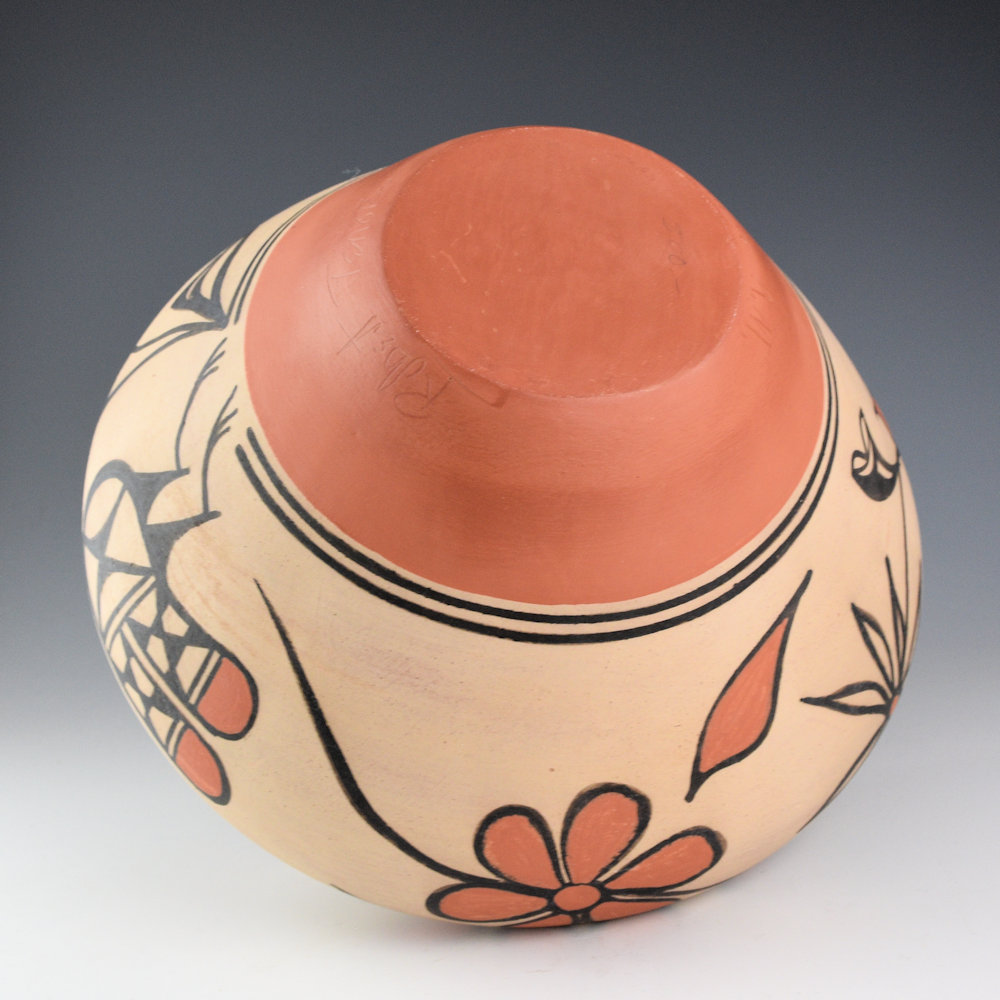 This is a very traditional large jar by Robert Tenorio. The jar is painted with wild spinach (black) and red clay. The jar has a high shoulder and a short neck. There is one bird along with a variety of flowers and vines encircling the piece. There is a spirit line on the outside that extends into the interior design. The jar is signed on the bottom in the clay, “Robert Tenorio, Kewa”. It is in excellent condition with no chips, cracks, restoration, or repair.