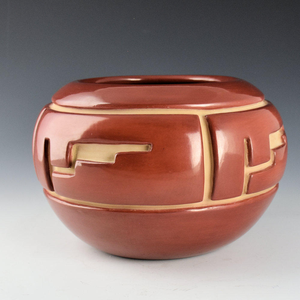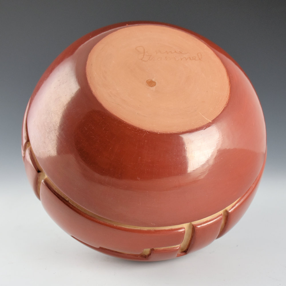 This is a stunning bowl by Jennie Trammel. She was a daughter of Margaret Tafoya. Over the years Jennie did not make a lot of pottery as she lived a very private life and was virtually never involved in markets or gallery shows. However, she created exceptional pottery with classic shapes and designs which were distinctive to her work. Each piece was coil built and it was the carving, with the rounded edges, which remains a visual key to her work. This is one of her very deeply carved pieces. The bowl has four sections with a “rain over the mesa” design. The edges are rounded and the background is slipped with the traditional white clay. The bowl is very highly polished a deep red coloration. She even polished the inside of the rim! The bowl was traditionally fired to this deep red coloration. It is signed, “Jennie Trammel” in the clay on bottom. This bowl is in excellent condition with no chips, cracks, restoration or repair.