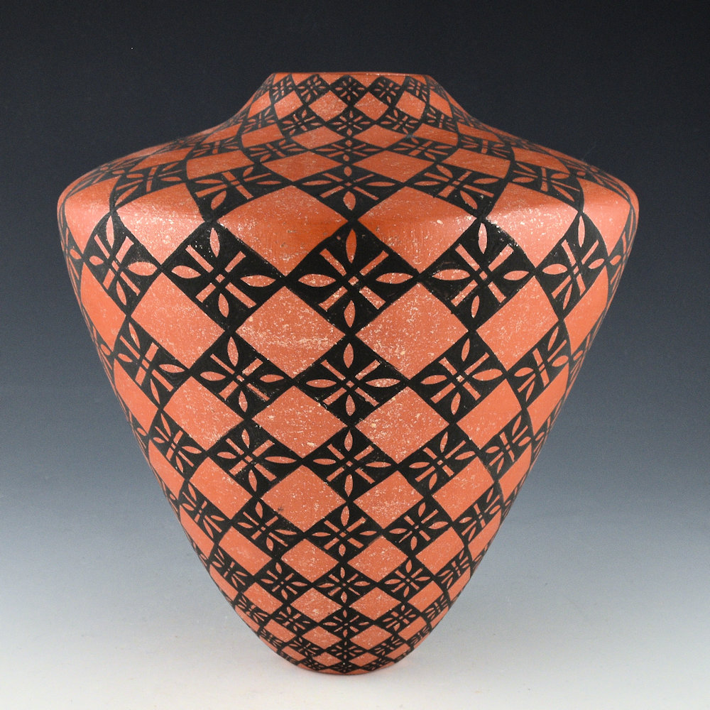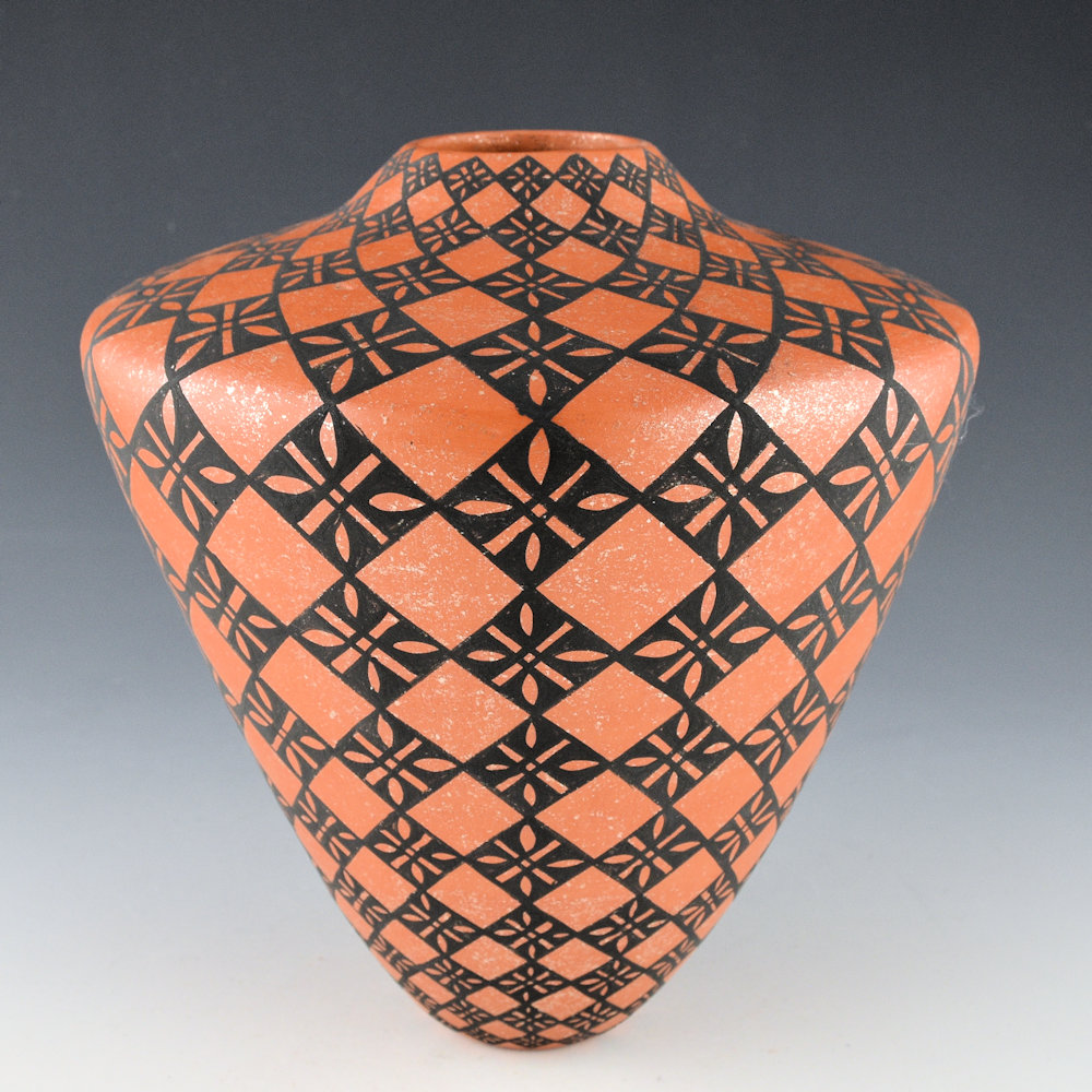Kevin Trancosa was from San Felipe Pueblo. He had a very short career making pottery from 1990-97. Each piece was coil built and made using clay from San Felipe Pueblo. He began with red micaceous clay and then started to work with white micaceous clay. His exceptional designs and forms were exceptional. He won numerous awards during his lifetime and his work can be found in museums nationwide. His peak in making pottery was from 1996-7 and there remain few of his important pieces that still come back to the market.