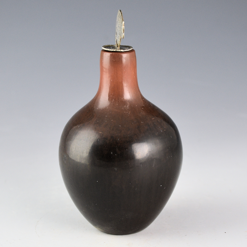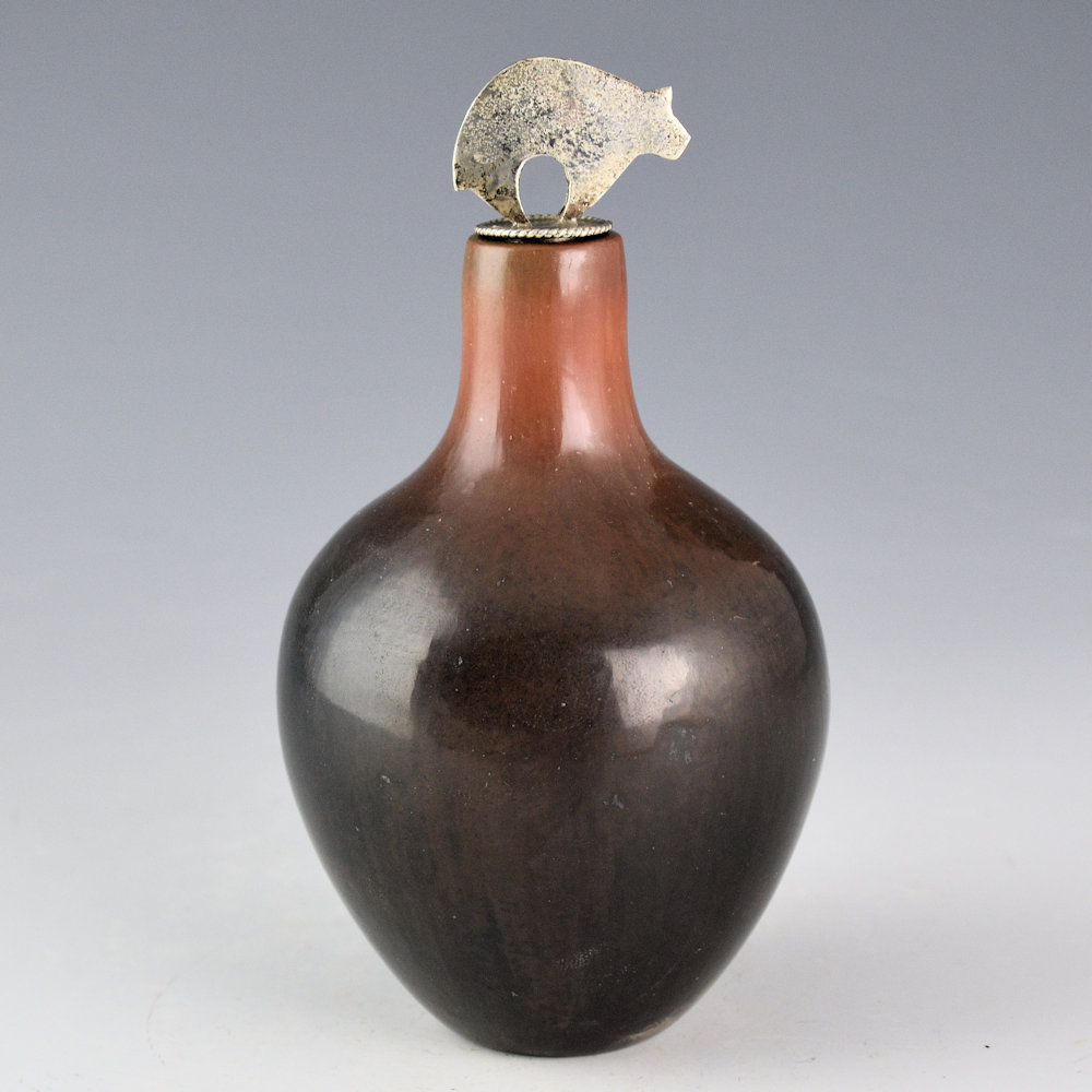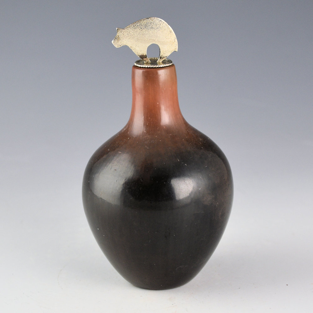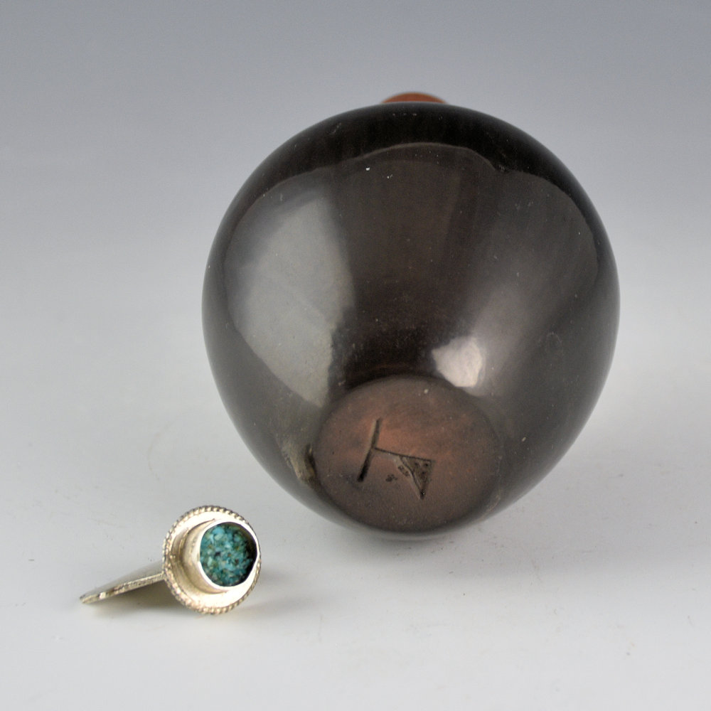 Jennifer Sisneros Tse-pe learned her distinctive style of pottery from her late husband, Tse-Pe. Each piece is coil built and etched with designs after the firing. This jar is fully polished and fired black. After the firing, the neck was two-toned sienna. The jar has a silver bear lid. When the lid is taken off, there is chip inlaid turquoise underneath! It is signed on the bottom with her hallmark. It is in excellent condition with no chips, cracks, restoration, or repair.