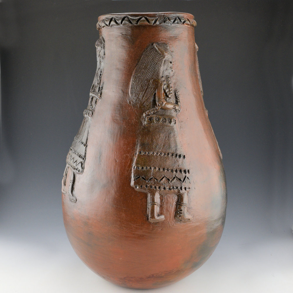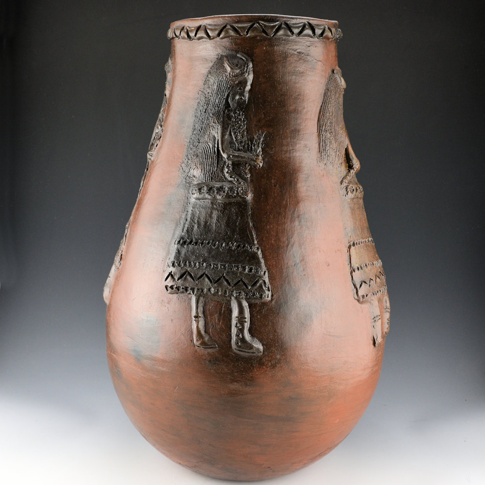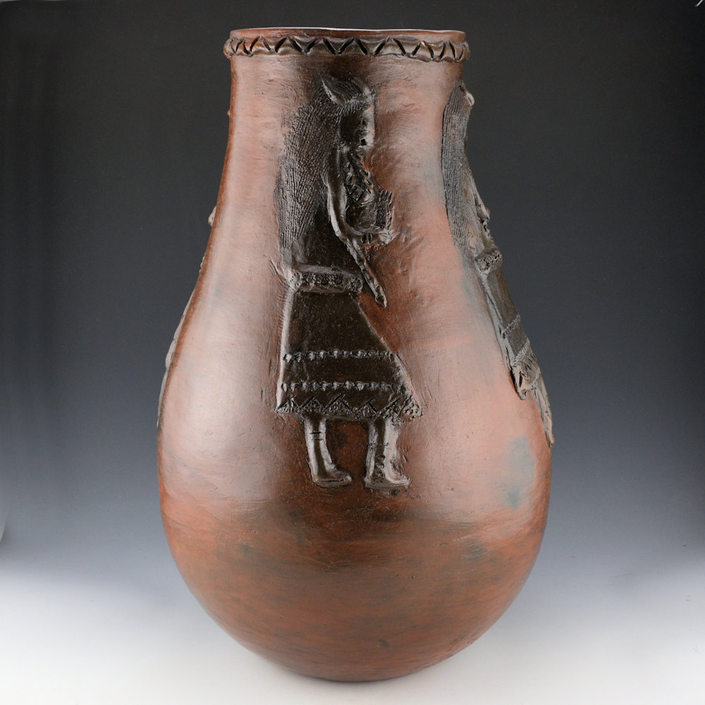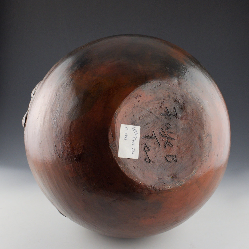 This is spectacular large jar by Faye Tso. She was one of the first Navajo potters to use unconventional imagery in her pottery. While traditional Navajo pottery has very little decoration, Tso applied images of corn maidens, lizards, and dancers to the surface of the clay. Her grandson, Jarred Tso, is also an important younger potter who is carrying on this amazing family tradition. This jar has a round shoulder and an elongated neck. The rim of the jar has an incised mountain design. However, it is the figures that are so striking in person. There are four women wearing buffalo headdresses and holding evergreens. Each figure is in appliqué on the surface, and each figure is detailed in design. Note how you can even see their necklaces! The jar was traditionally fired and then covered in pinon pitch. It is signed on the bottom in the clay, “Faye Tso”. It is in excellent condition with no chips, cracks, restoration, or repair. Definitely a great piece of Navajo pottery history! It’s not often we see pieces by Faye in this size or creativity of design, making it an important piece of her history in clay.