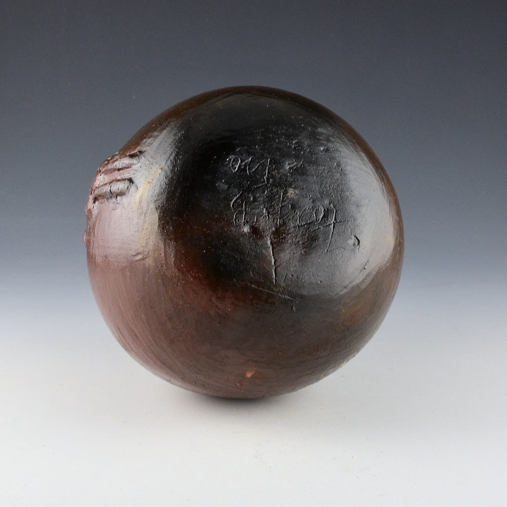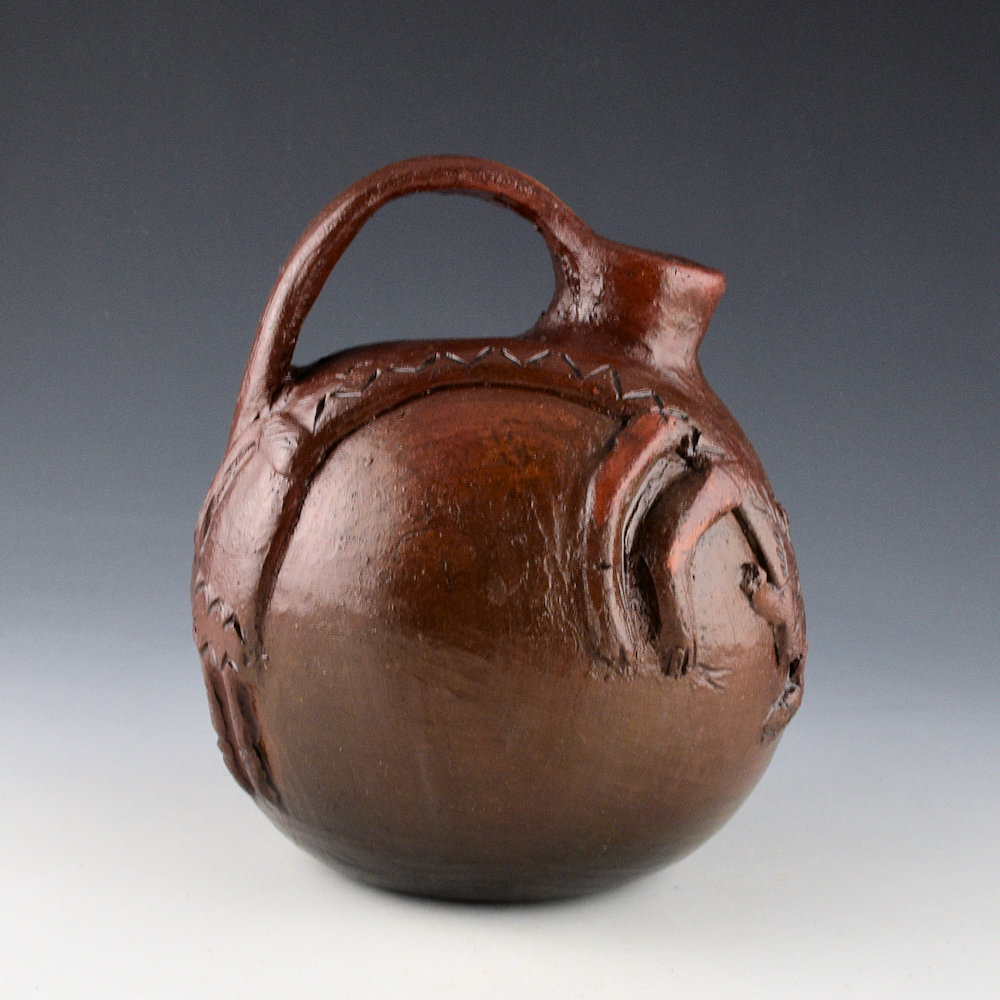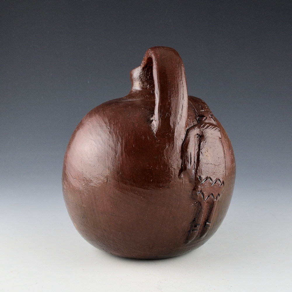 Faye Tso was one of the first Navajo potters to use unconventional imagery in her pottery. While traditional Navajo pottery has very little decoration, Tso applied images of corn maidens, lizards, and dancers to the surface of the clay. Her grandson, Jarred Tso, is also an important younger potter who is carrying on this amazing family tradition. This is one of her most famous designs on a canteen. The piece is and there is a Yei figure on one side. The Yei is raised in relief with intentions in the clay. Yei figures are often seen in Navajo sandpaintings and rugs. “Yei” (pronounced “yay”) is the Navajo name for the benevolent beings who bring their healing power to medicinal ceremonies still performed today. The canteen is a strong shape with a handle and a single spout. It was traditionally fired and is covered at the end with pinon pitch. It is signed on the bottom in the clay, “Faye Tso”. It is in excellent condition with no chips, cracks, restoration, or repair. Definitely a great piece of Navajo pottery history!