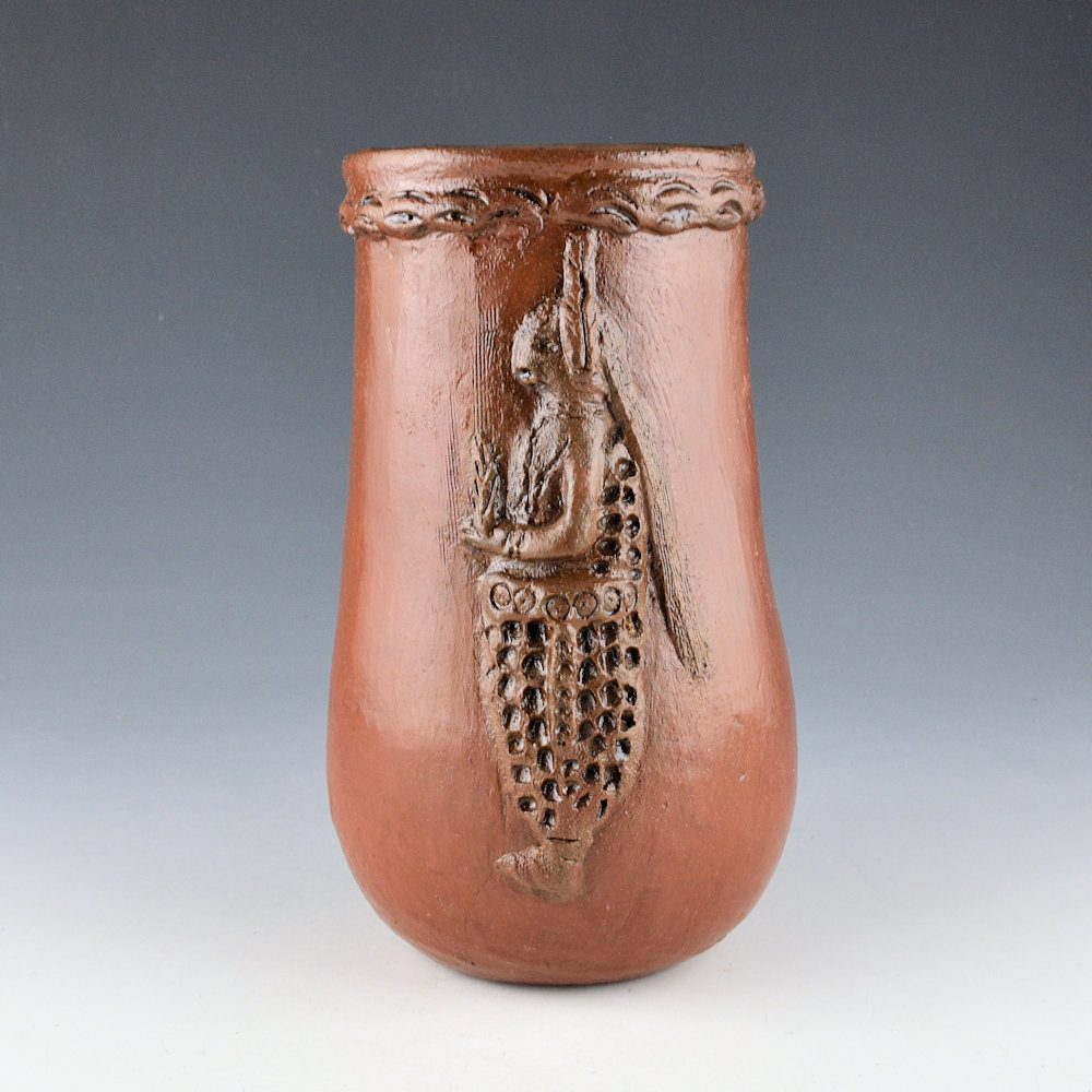 Faye Tso was one of the first Navajo potters to use unconventional imagery in her pottery.  While traditional Navajo pottery has very little decoration, Tso applied images of corn maidens, lizards, and dancers to the surface of the clay.  Her grandson, Jarred Tso, is also an important younger potter who is carrying on this amazing family tradition.  This tall water jar is a classic shape.  There are two of her classic corn maidens on the jar, one on each side. They are in applique and highly detailed.  The neck of the jar has a raised band with rainbow designs.  The jar was traditionally fired and is covered at the end with pinon pitch.  It is signed on the bottom in the clay, “Faye Tso”.  It is in excellent condition with no chips, cracks, restoration, or repair.  Definitely a great piece of Navajo pottery history!