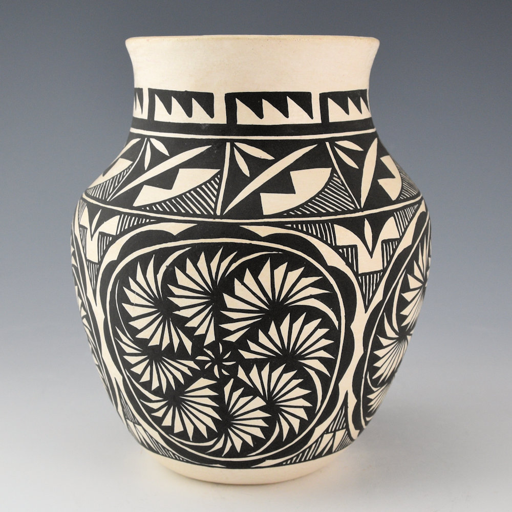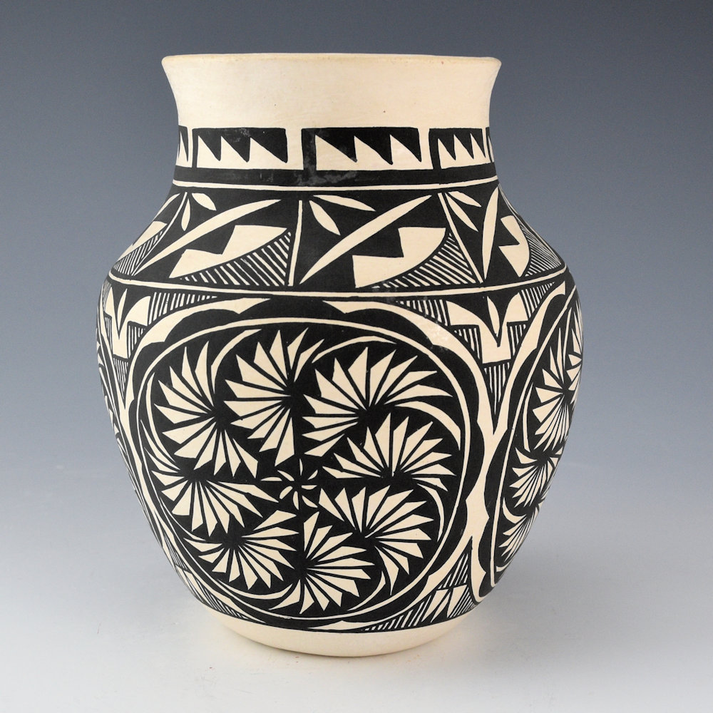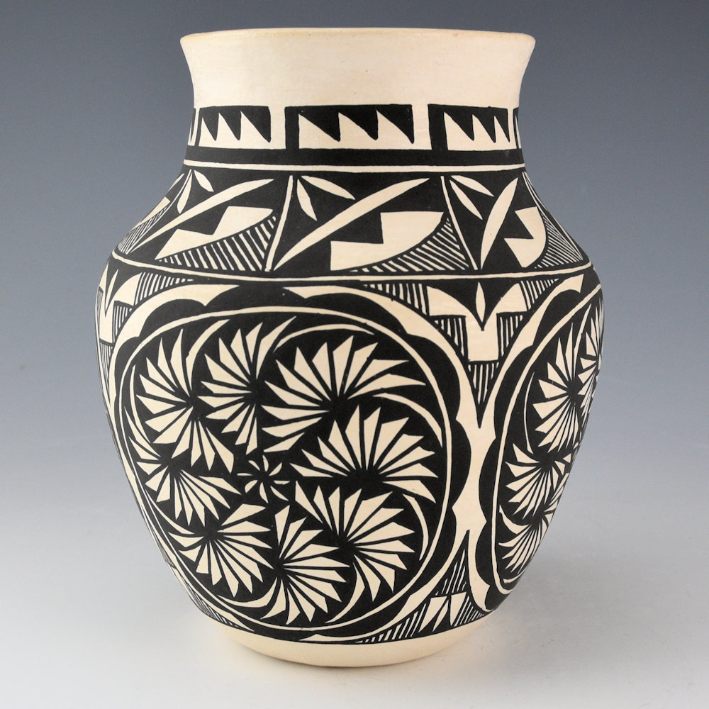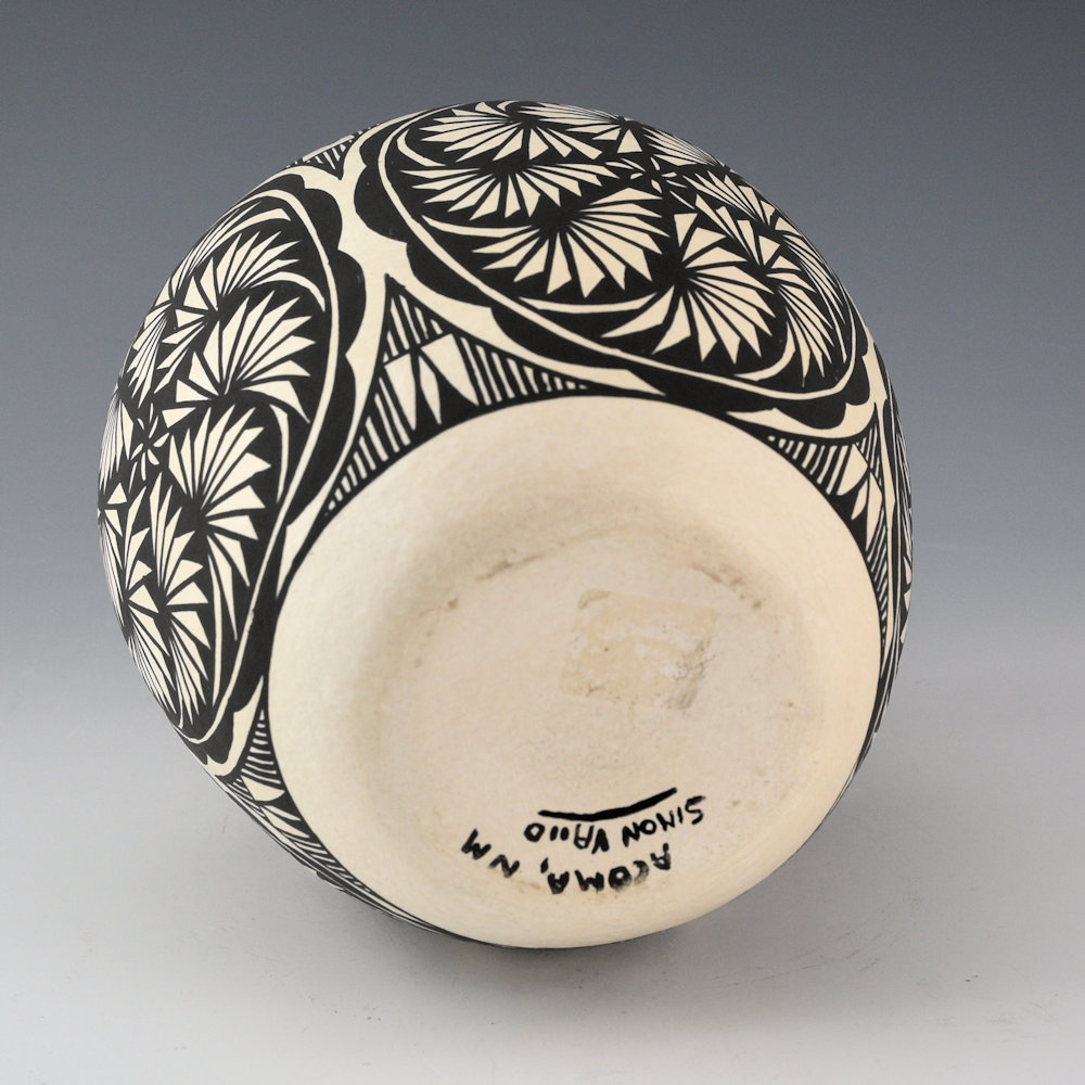 This jar was made by Simon Vallo (1948-1999). He was a son of Henry and Juanita Vallo. He learned to make pottery from his mother. He married Marie Garcia and was the father of Kim Vallo, Leland Vallo, and Thomas Vallo. This jar is coil-built from native clay and painted with bee-weed. The jar has medallions with swirling plant designs. They are separated by plant and fine-line rain imagery. The jar is signed, “Simon Vallo”. It is in excellent condition with no chips, cracks, restoration or repair.