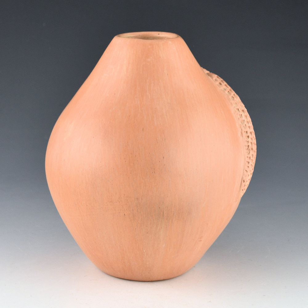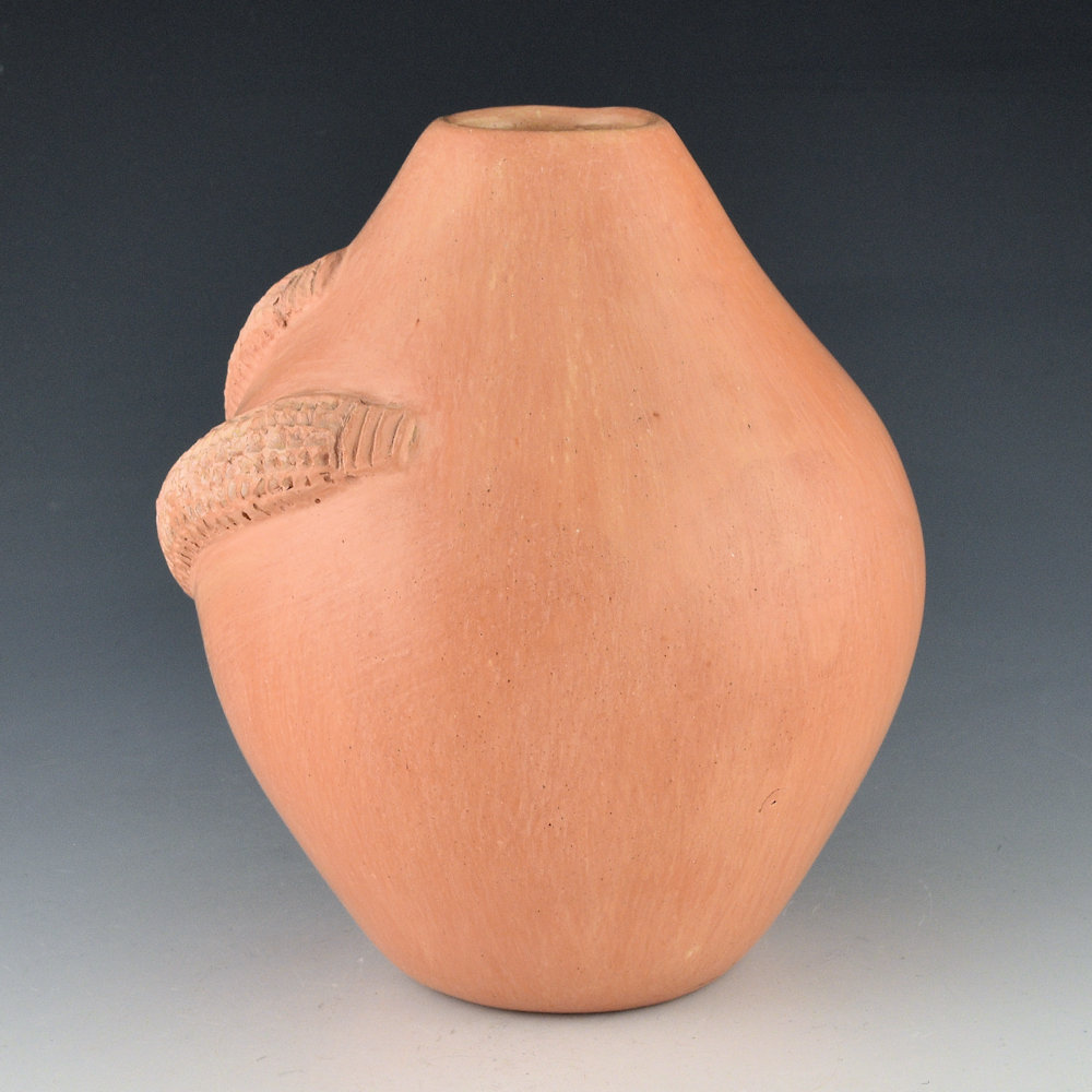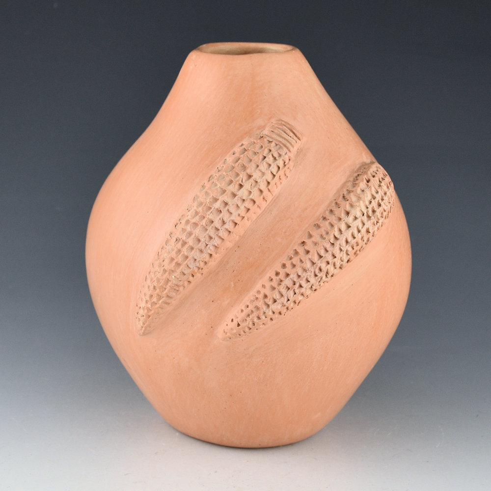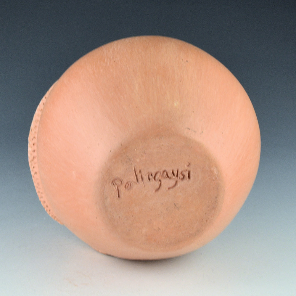 Elizabeth White created distinctive pottery using the various colors of Hopi clay. She originated the use of the ear of corn as a design in repousse (pushed out from the inside) on her pottery. Her pottery is all signed in the clay with her Hopi name Polingaysi, which means, “butterfly sitting among the flowers in the breeze”. This jar is one of her classic narrow jars with two ears of corn. The coloration of the clay is the traditional red clay (well, reddish-orange), which is used in Hopi pottery. The coloration is striking on this larger jar. The entire piece is stone polished to a high shine except for the two ears of corn which are unpolished matte. The narrow shape is very much like the jars that her nephew Al Qoyawayma makes which he calls “wish pots”. He tells the story that the name comes from Elizabeth as she said people would look at the pieces and say, “I wish I could have one”. This jar is in excellent condition with no chips, cracks, restoration or repair. Interestingly, Polingaysi was a school teacher and taught at Hopi and Navajo schools for almost 40 years. On retirement from teaching, she became an artist, a poet, and a philosopher. Her career as a potter was begun late in life, after her retirement, so there is very little of her work available. This jar was originally purchased in 1981. It is a classic of her work and an important addition to any collection!