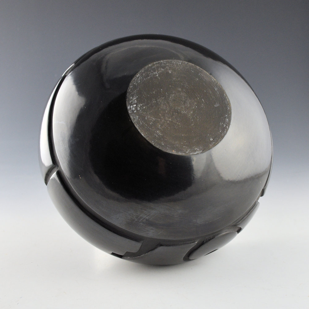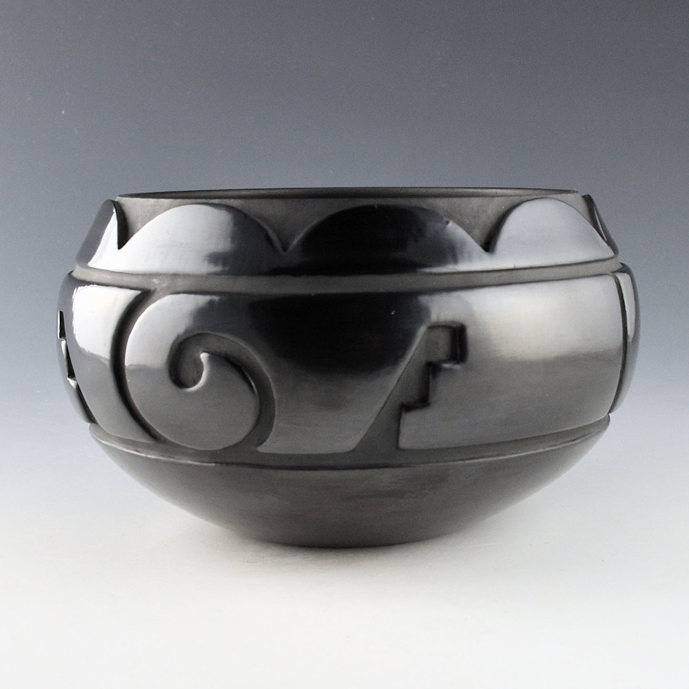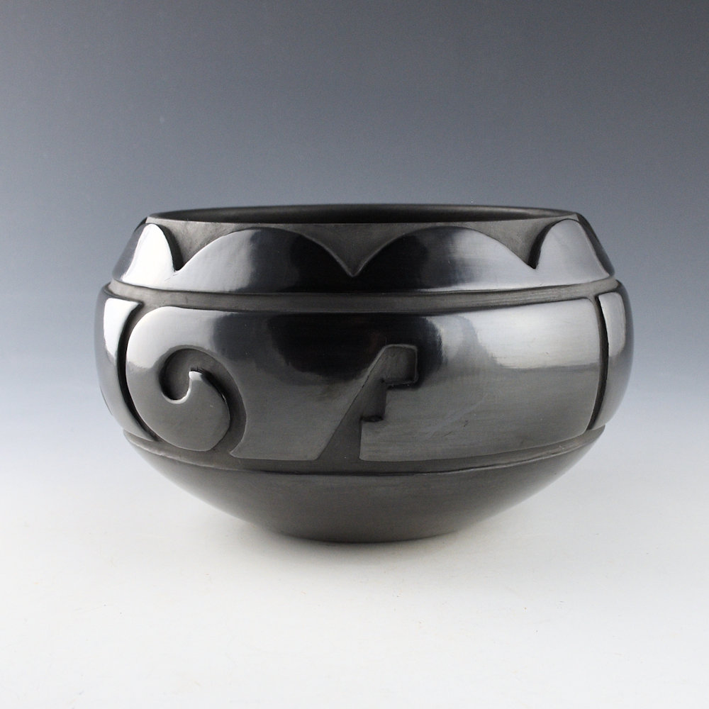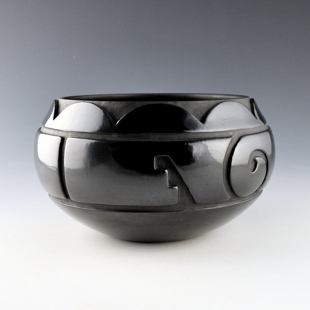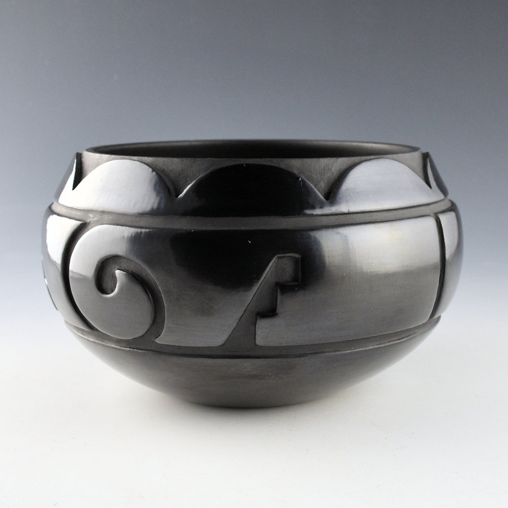 Daryl Whitegeese is known for his use of classic Santa Clara forms and his amazing, polished surfaces. This large bowl has a round shoulder and a slightly sloping neck. The neck is carved with nine half-circle cloud patterns. Around the body of the bowl, it is carved with swirling clouds, lightning, and straight lines for the train. It is deeply carved and the edges almost feel sharp to the touch! The bowl was traditionally fired a deep black coloration. The bowl is signed on the bottom, “Daryl Whitegeese”. It is in excellent condition with no chips, cracks, restoration, or repair.