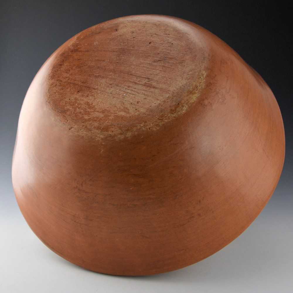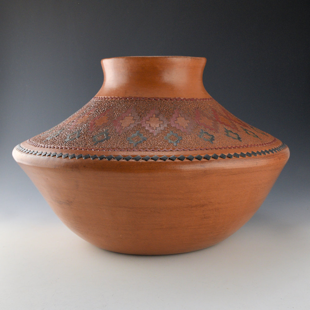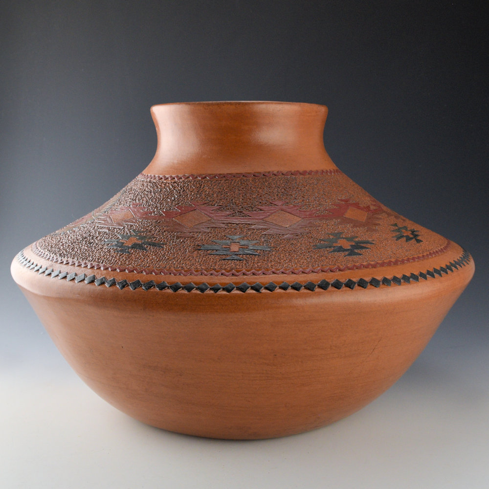 This is a traditional jar by Lorraine Williams. It has a low, sharp shoulder and short neck with a turned-out rim. The top of the shoulder it etched with a sun on one side and the moon on the other. Separating them are stars. The jar was traditionally fired to create the surface colorations. After the piece is fired, it is covered in pinon pitch, which is typical of all traditional Navajo pottery, harkening back to when it was utilitarian. The jar is signed on the bottom, “LW”. It is in very good condition with no chips, cracks, restoration, or repair.
