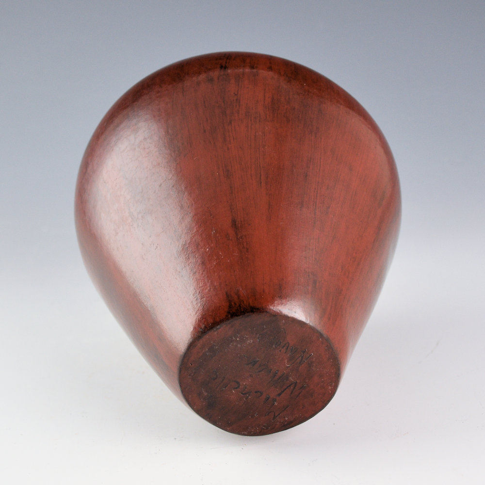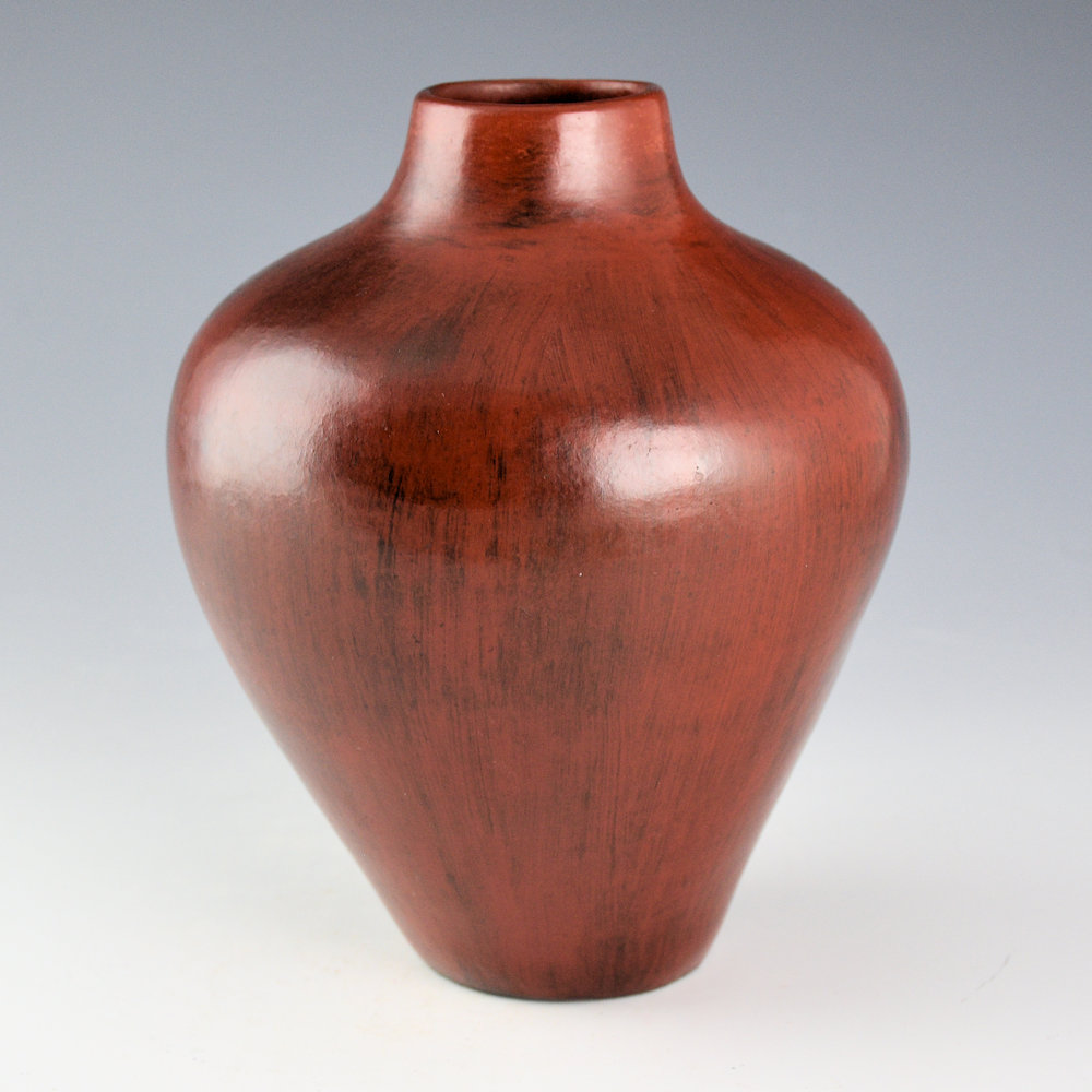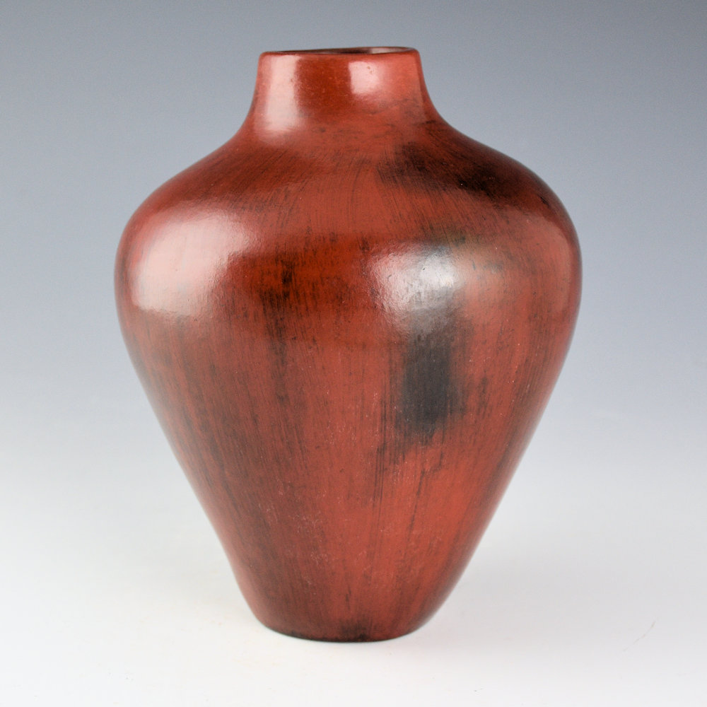 Michelle Williams is a daughter of noted Navajo potter Alice Cling. This is a classic shape with a high shoulder and short neck. The jar is fully polished red. It was traditionally fired to create colorations on the surface that range from red to black. The piece was covered in pinon-pitch after the firing, a continuation of the traditional Navajo pottery when pine pitch was used to make the pottery waterproof. The jar is signed on the bottom in the clay, “Michelle Williams”.