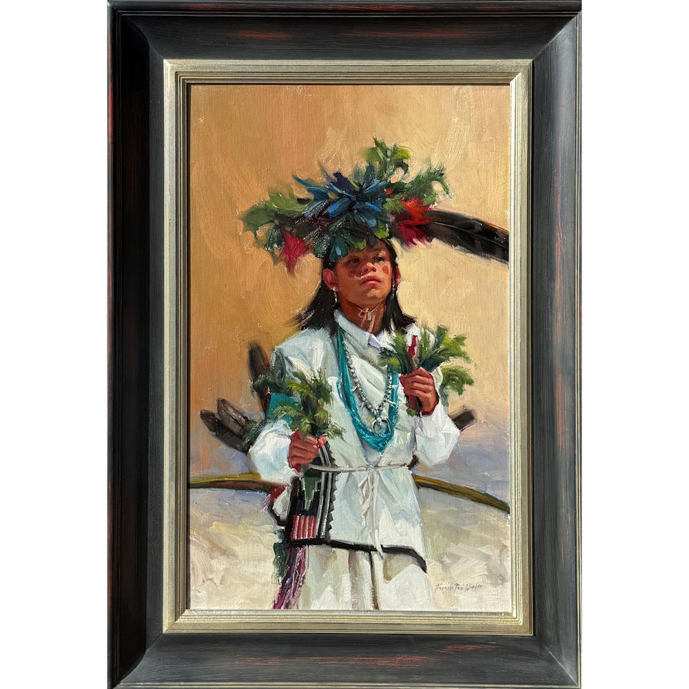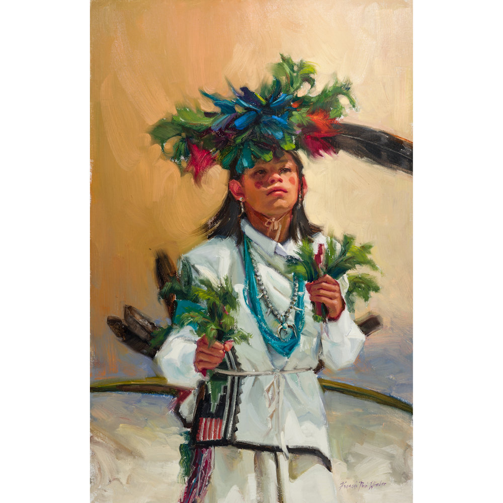 Kwani seeks to explore her Santa Clara Pueblo Tewa heritage through painting and draws on her religious beliefs when developing and painting a native figure. Through her paintings, she seeks to preserve, share, and educate about her unique heritage.