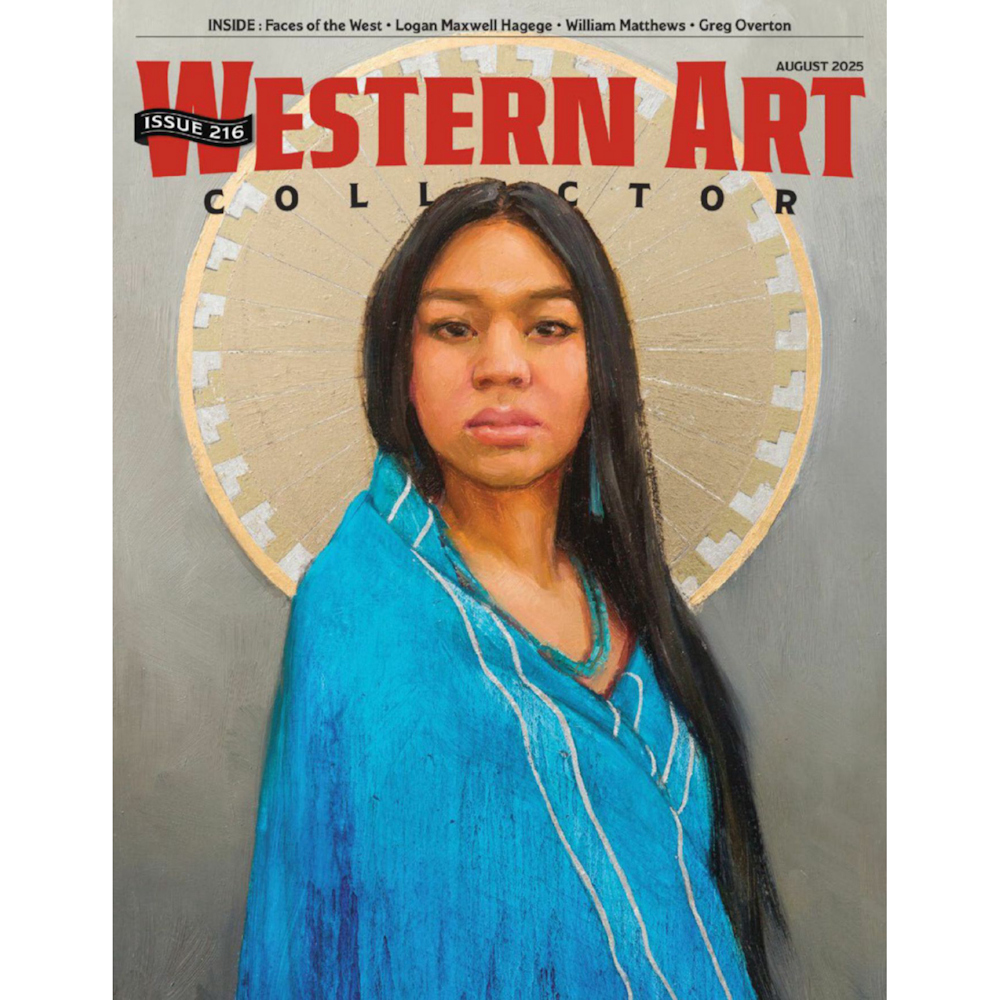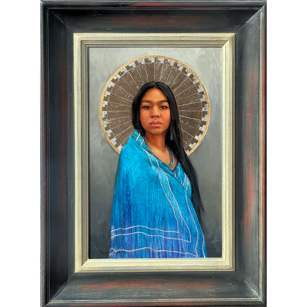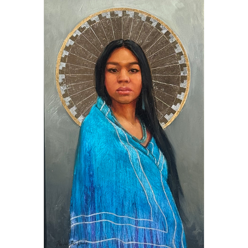 This is a traditional oil painting by Kwani Povi Winder.  It has vibrant colors, deep emotions, and loose brushstrokes. The piece is entitled, “Standing Strong“and features a silver ‘halo’ above the head of a female subject.  This piece is part of her show, “She Remembers” and is also featured on the front cover of Western Art Collector magazine.  Kwani is the first Native American woman to be on the cover of the magazine. The piece is framed.