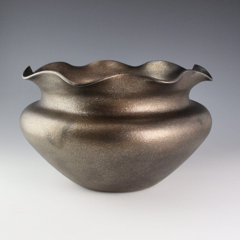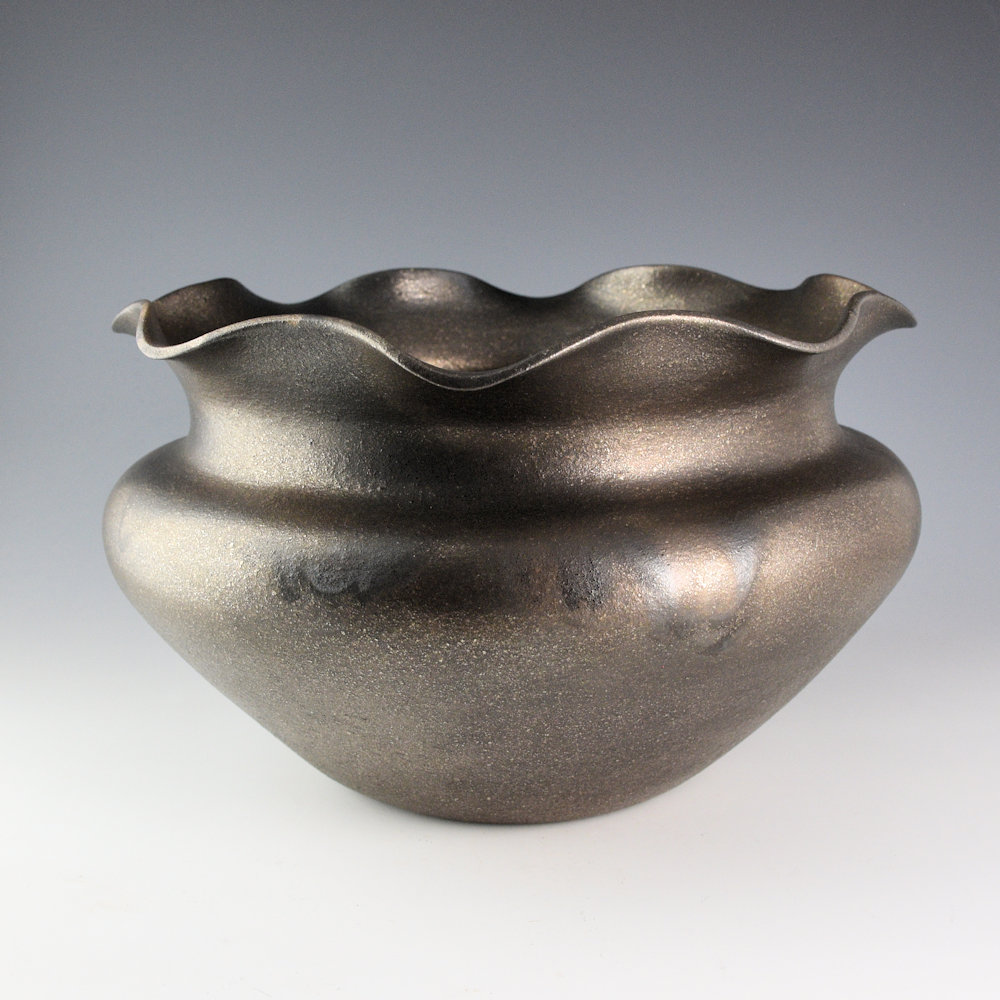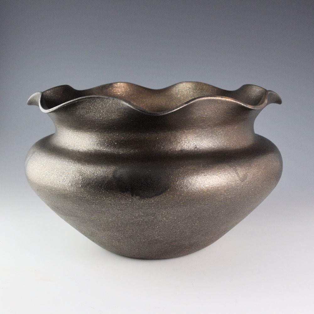 This is a striking large jar by Angie Yazzie. She is renowned for her thin-walled Taos pottery. Each piece is coil-built and made from micaceous clay near Taos Pueblo. Angie focuses on traditional shapes and makes each piece nearly paper-thin! It almost feels like there is nothing there when you hold one! This jar is thin-walled and a shape she calls her “Grandmother Jar”. It is a graceful shape with a wide shoulder that just slightly dips down before extending up to the rim. The rim of the jar is fluted. The jar is made from micaceous clay, so when it is fired, it has a sparkling/metallic appearance. Angie fires her pieces using wood, so it is a firing process different from Santa Clara blackware. The result is that you can very slightly see the fire-clouds across the surface of the piece. It looks like it is still in the fire! That is a great addition, as it speaks to the traditional firing methods! The jar is signed on the bottom, “Angie Yazzie”. She has won numerous awards for her work, including “Best of Pottery” at Santa Fe Indian Market in 2017.
