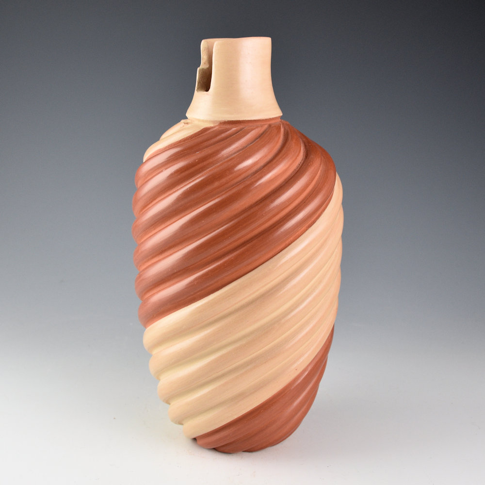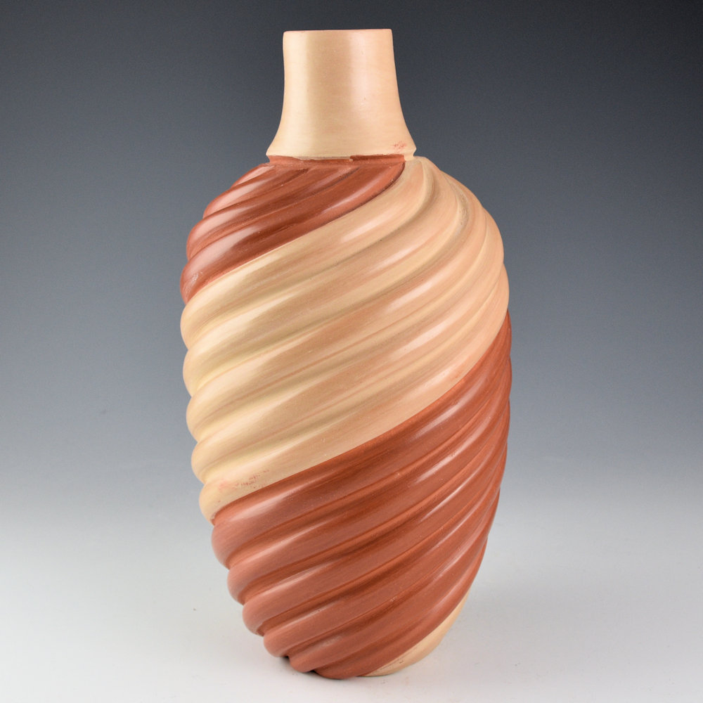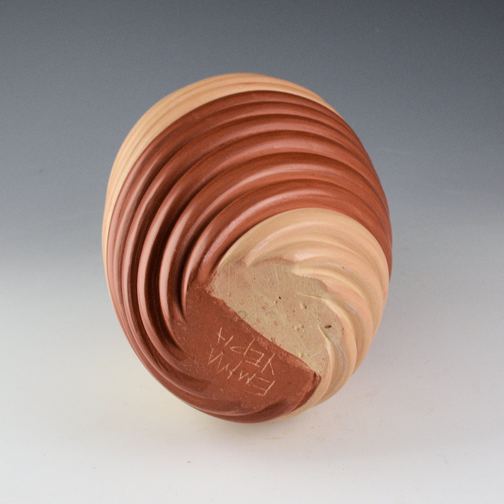 Emma Yeppa (b. 1965) is known for her carved and polished pottery. She began making pottery at age 13 under the guidance of her mother, Ida Yepa. She is a cousin of Marcella Yepa and a niece of Alvina Yepa. This jar is coil-built, carved and stone-polished. The jar has a cylindrical shape with a carved kiva step rim. The body of the jar has 11 swirling melon ribs. Five are polished tan (the natural color of the clay) and six are polished red. It is signed on the bottom in the clay, “Emma Yepa”. It is in excellent condition with no chips, cracks, restoration, or repair.