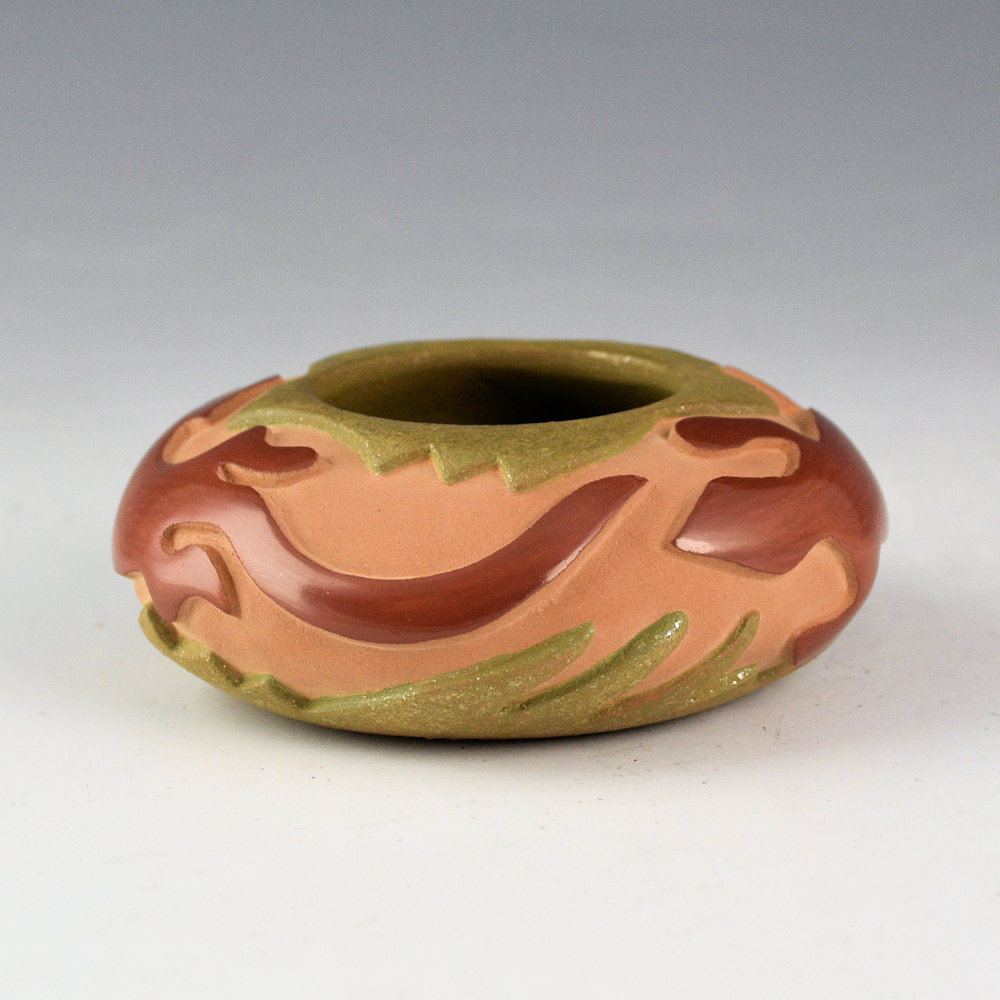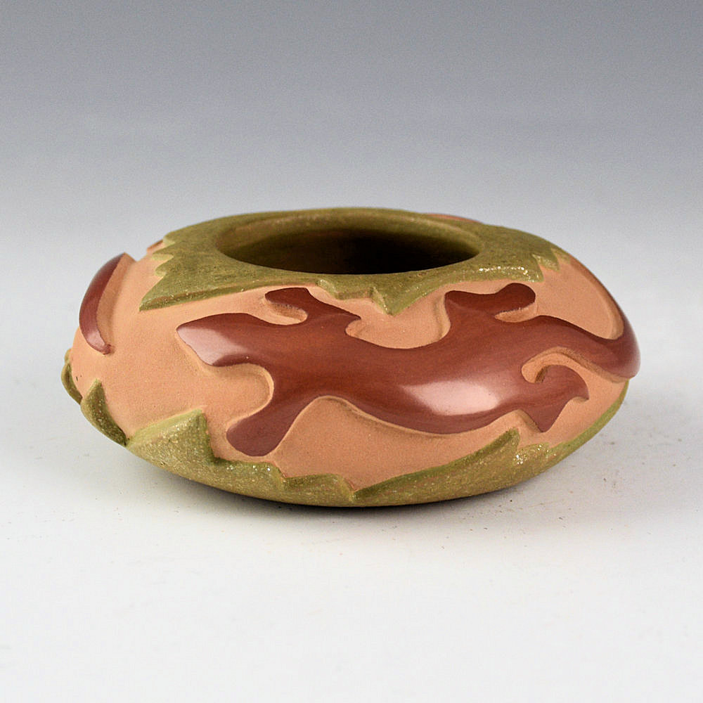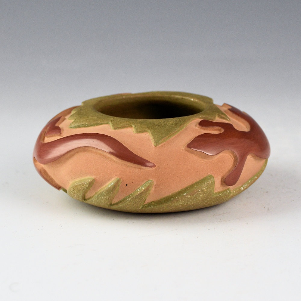 Christopher Youngblood creates intricately carved vessels that reflect a perfect balance of matte and polished surfaces with intricately carved designs. This bowl has a round shape and it is carved with two lizards. They are fully polished red. The rim of the bowl has carved rock shapes, as does the base. The rim, base, and interior are all slipped with green clay and mica. This bowl continues his evolution in design and color. The bowl was traditionally fired. It is signed on the bottom, ‘Chris Youngblood”.
