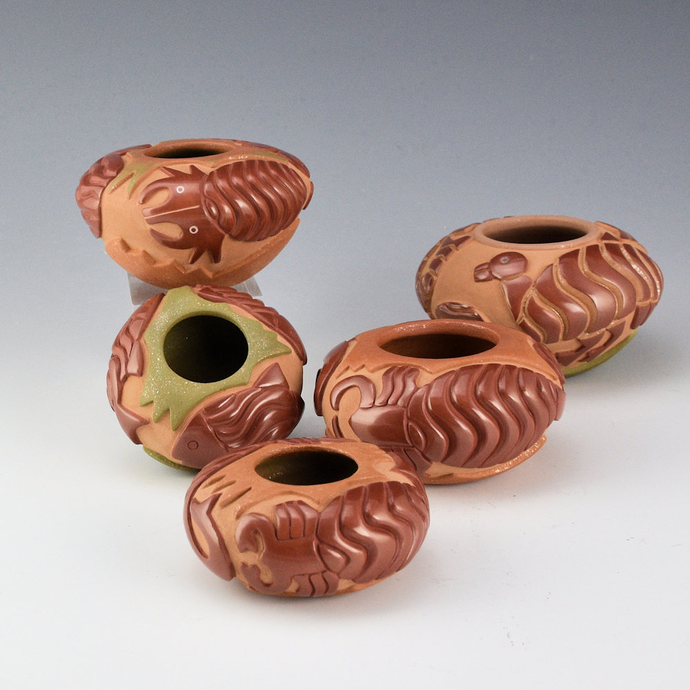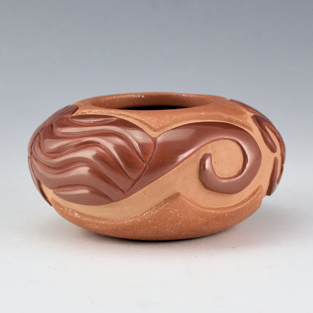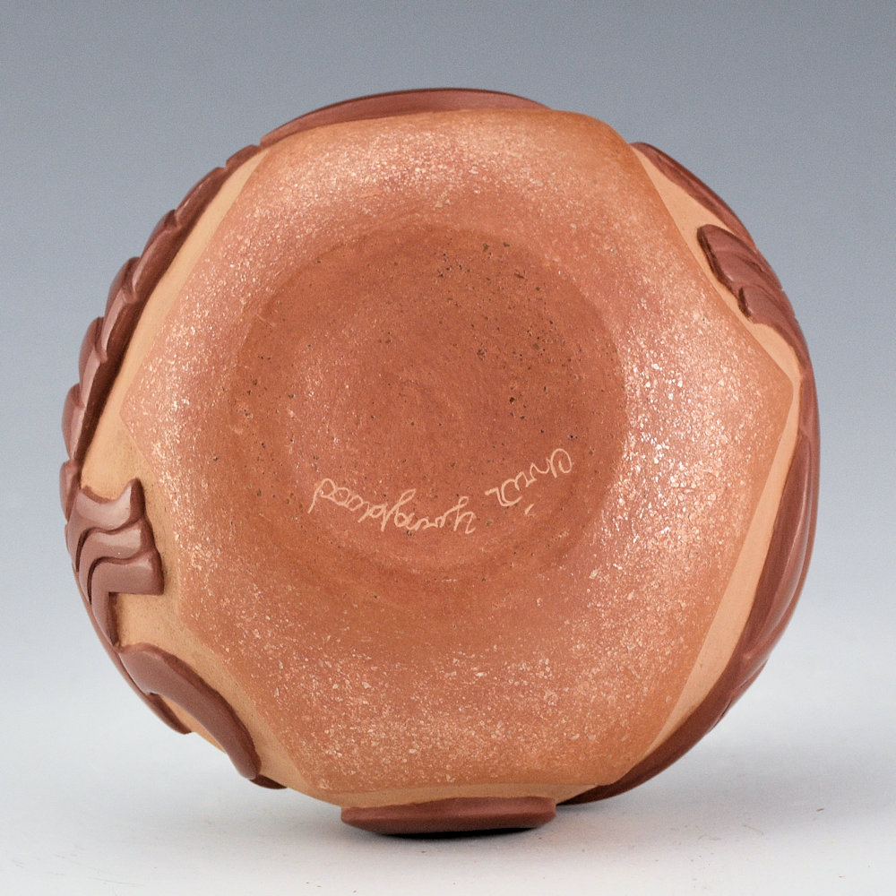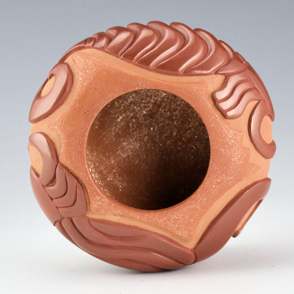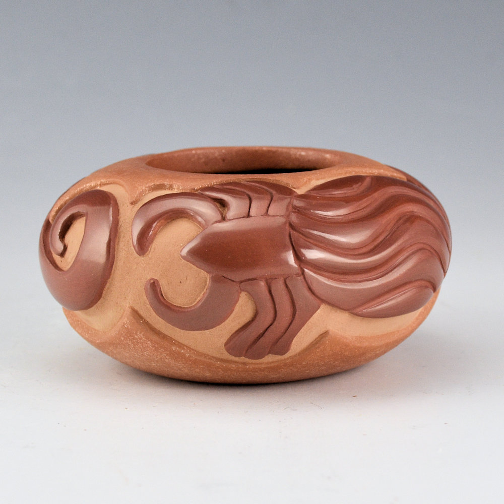 Christopher Youngblood creates intricately carved vessels that reflect a perfect balance of matte and polished surfaces with intricately carved designs. This bowl has a wide shape and it is carved with two Mimbres scorpions. They are each fully polished and note how he used the classic melon ribs to create their bodies. The top and bottom are slipped with mica, and the inside has green mica. His new smaller pieces are an exciting evolution in his use of design and color. The jar was traditionally fired. It is signed on the bottom, ‘Chris Youngblood”.