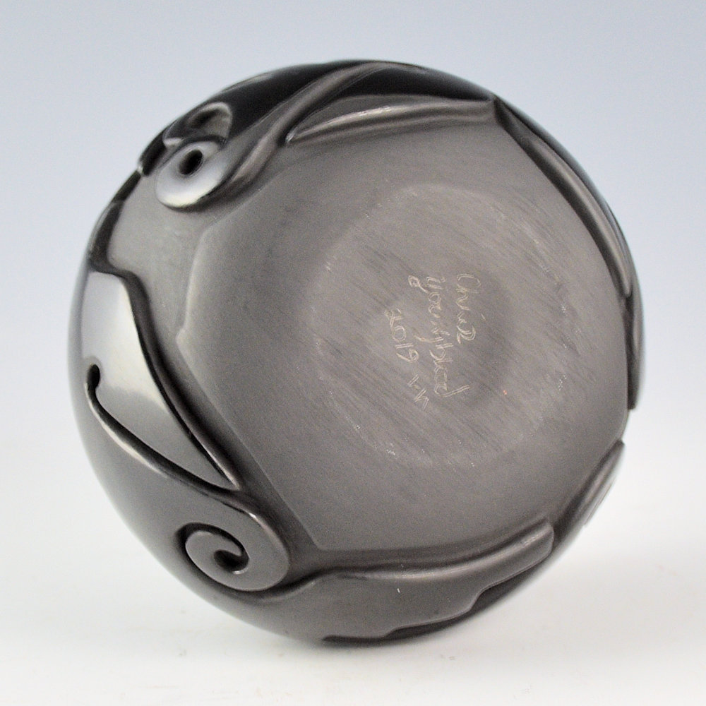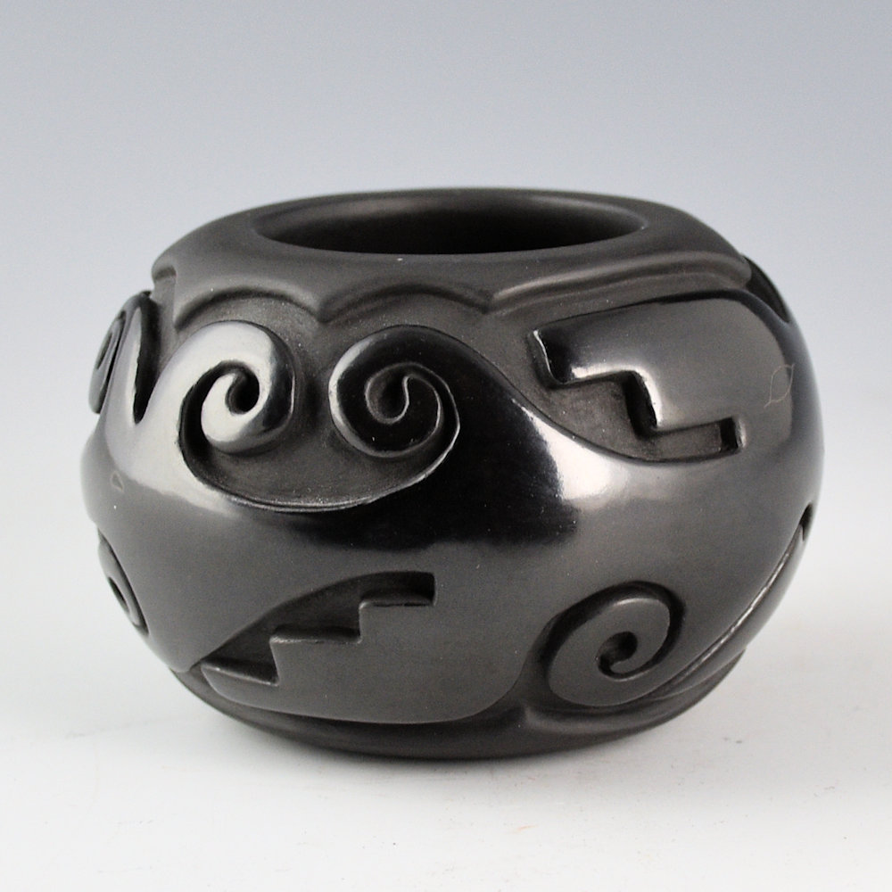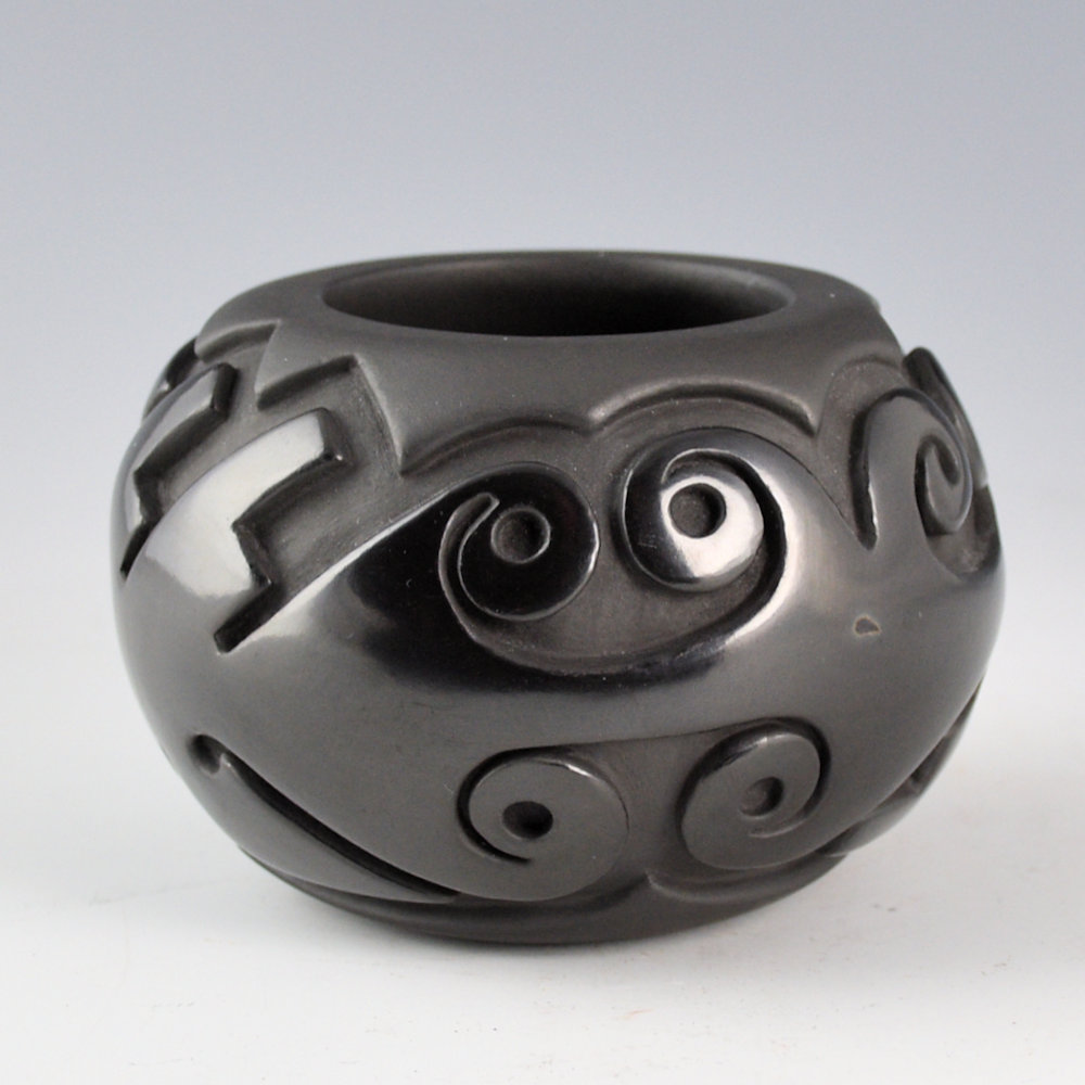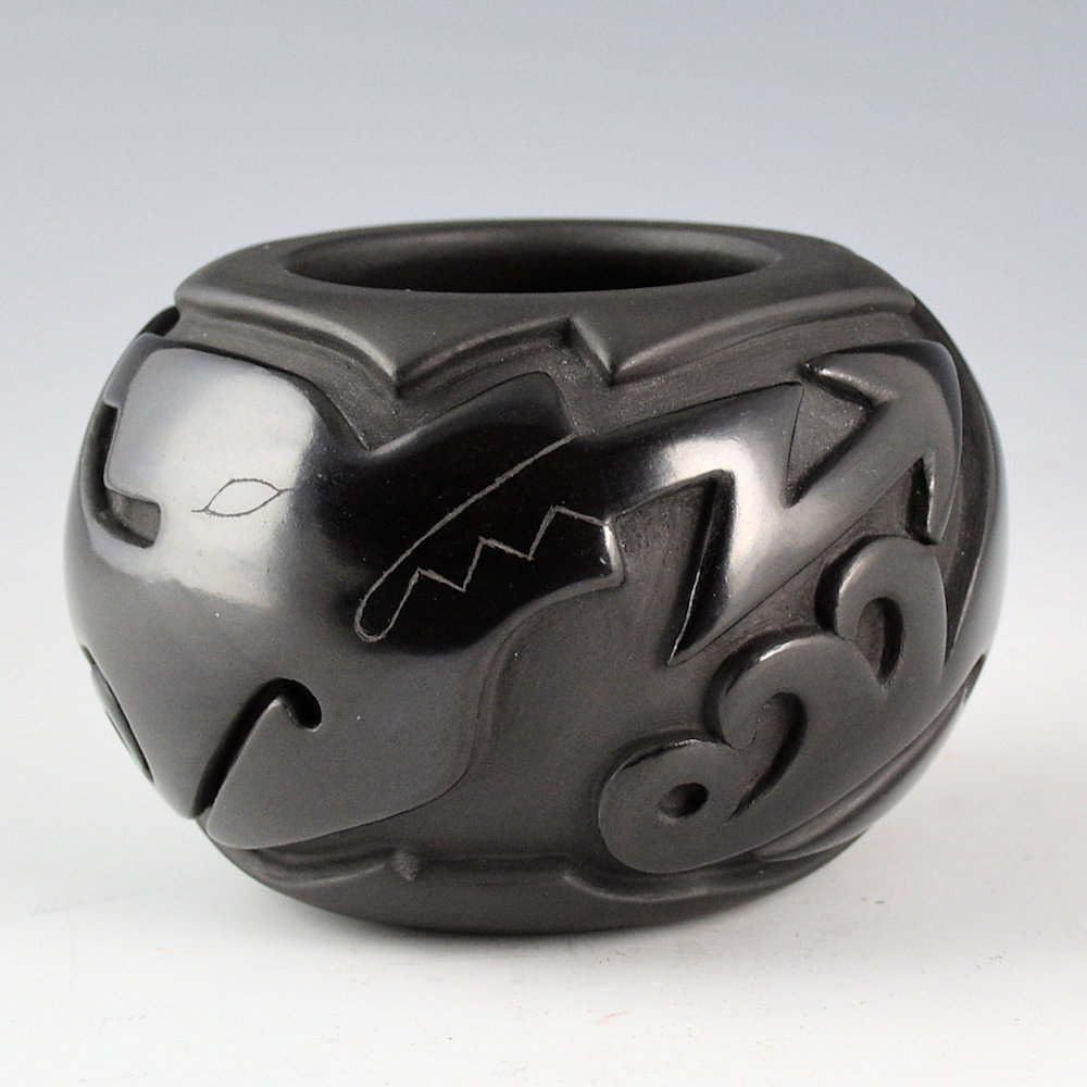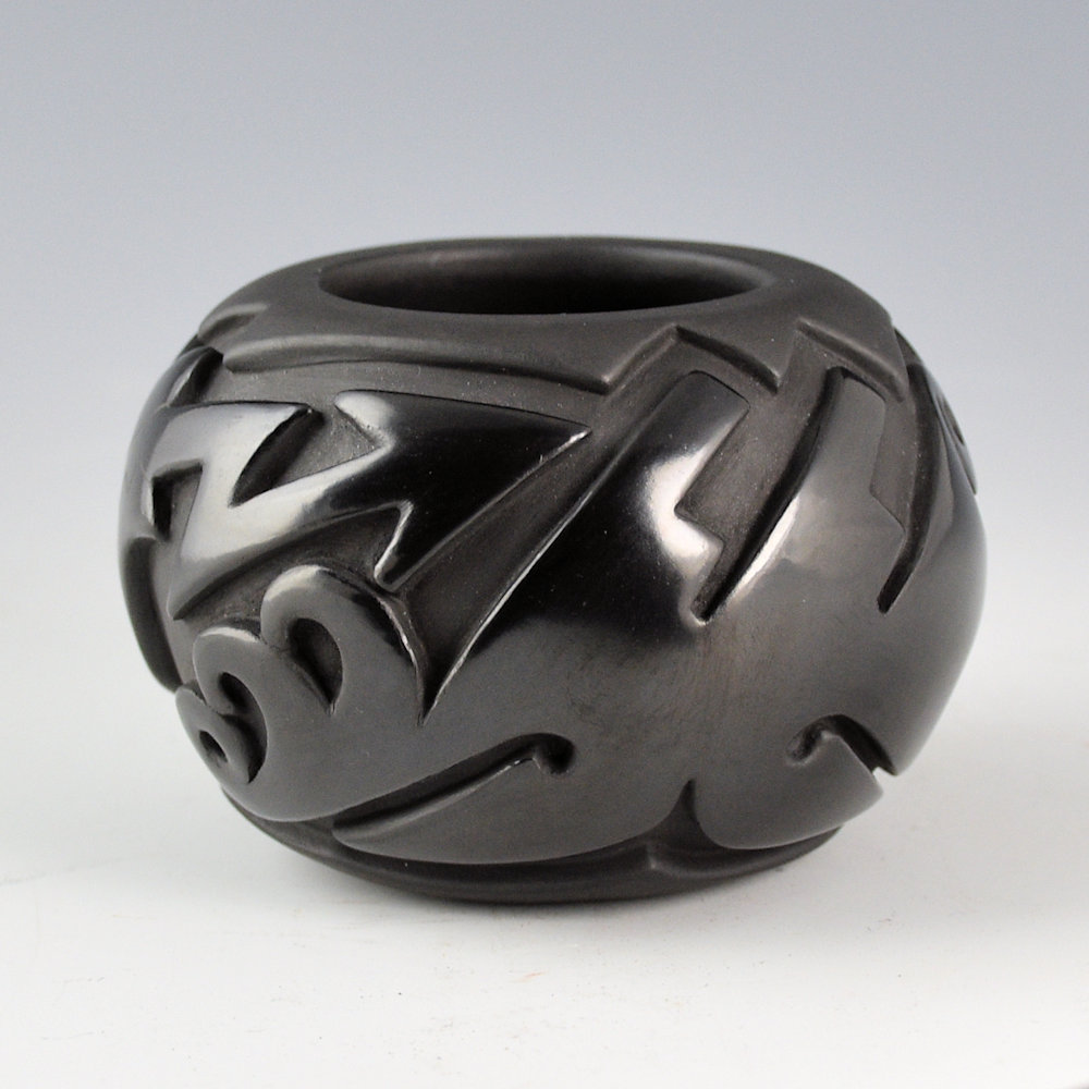 Christopher Youngblood creates intricately carved vessels that reflect a perfect balance of matte and polished surfaces with intricately carved designs. This bowl has an avanyu encircling the piece. The avanyu is intricately carved with swirls and angular lines. Note the depth of the carving when looking at the bottom of the bowl. The piece was fired a glassy black coloration. It is signed on the bottom, ‘Chris Youngblood”. Chris has won “Best of Pottery” at Santa Fe Indian Market and “Best of Pottery” at Gallup Ceremonials. He was featured in the book, Spoken Through Clay, and continues to be one of the leading young potters working today. It is in excellent condition with no chips, cracks, restoration, or repair.