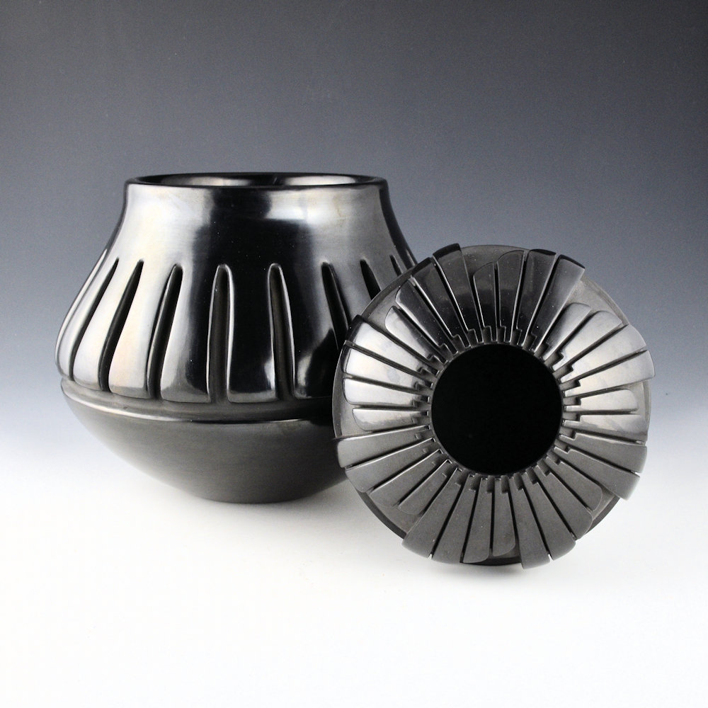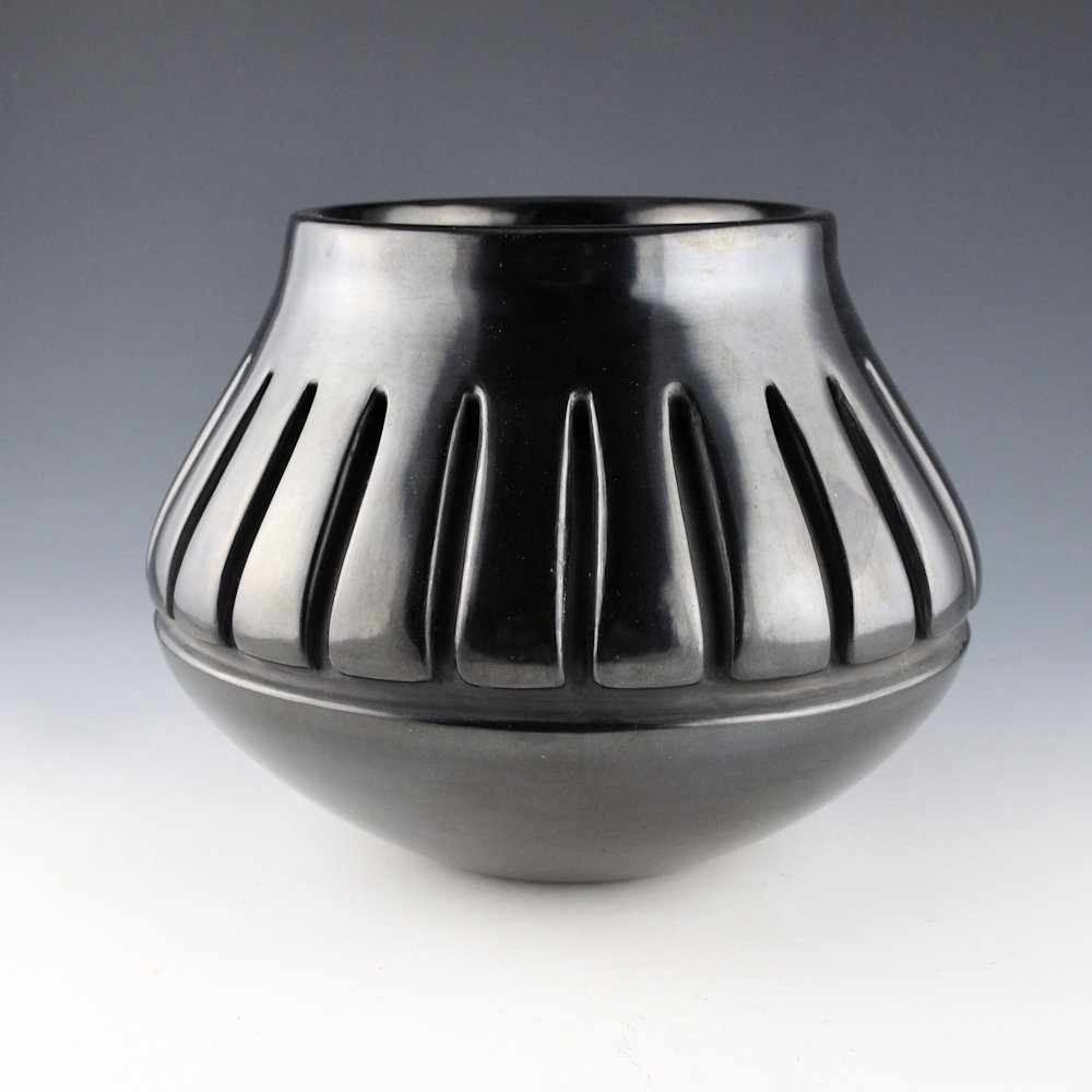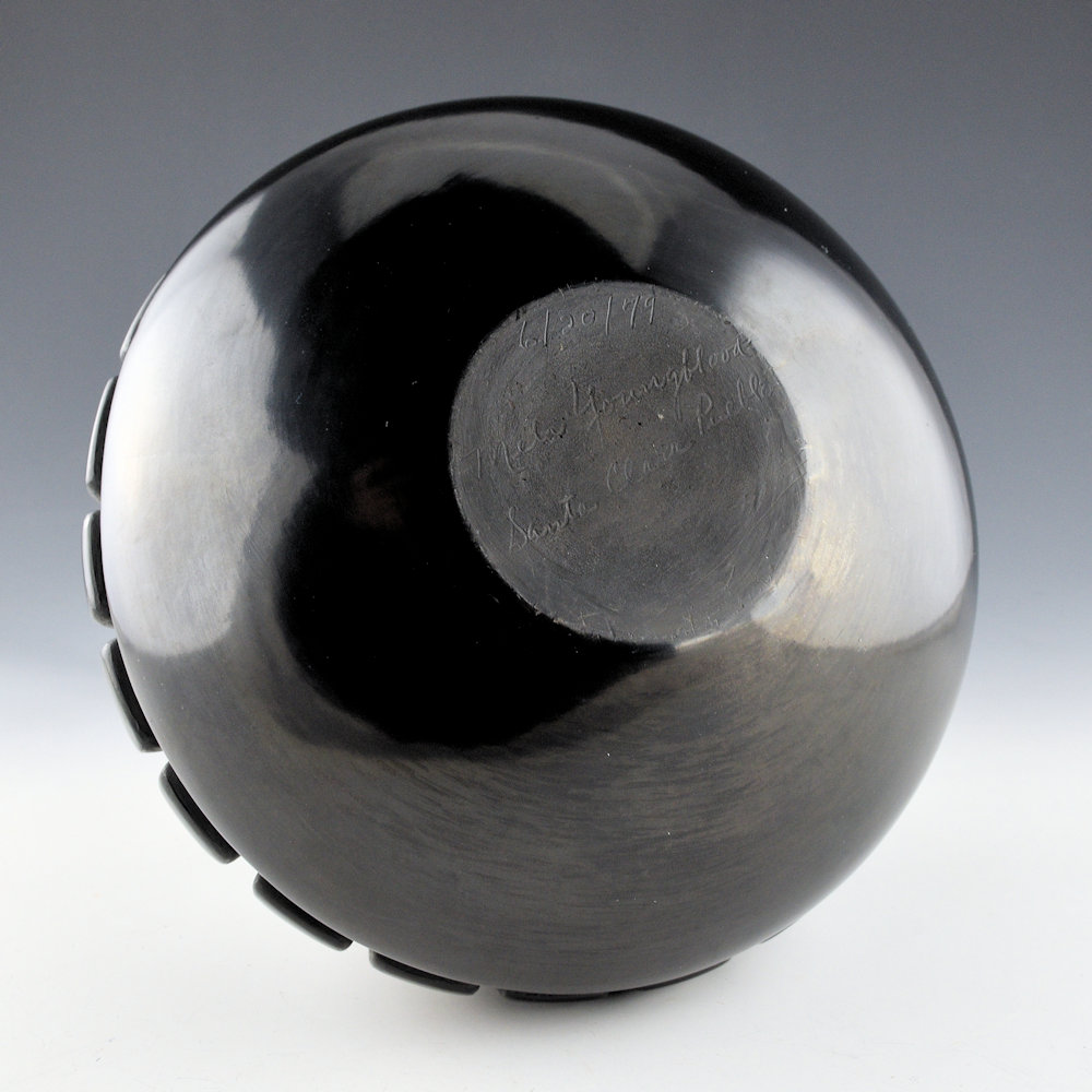 This is a classic wide shoulder jar by Mela Youngblood. She was a daughter of Margaret Tafoya and began making pottery in the late 1960s. She quickly achieved a distinctive style for her work. Each piece of her work was coil-built, carved, and stone-polished. This jar is from 1979. It has a round shoulder and a short neck. The jar is carved around the center with 22 feathers. The straight, linear style of the feathers, accentuates the bold shape of the jar. The top and bottom sections, along with the feathers, are all stone-polished to a high shine. The jar was traditionally fired black. It is in excellent condition with no chips, cracks, restoration, or repair. It is signed on the bottom, “Mela Youngblood”.