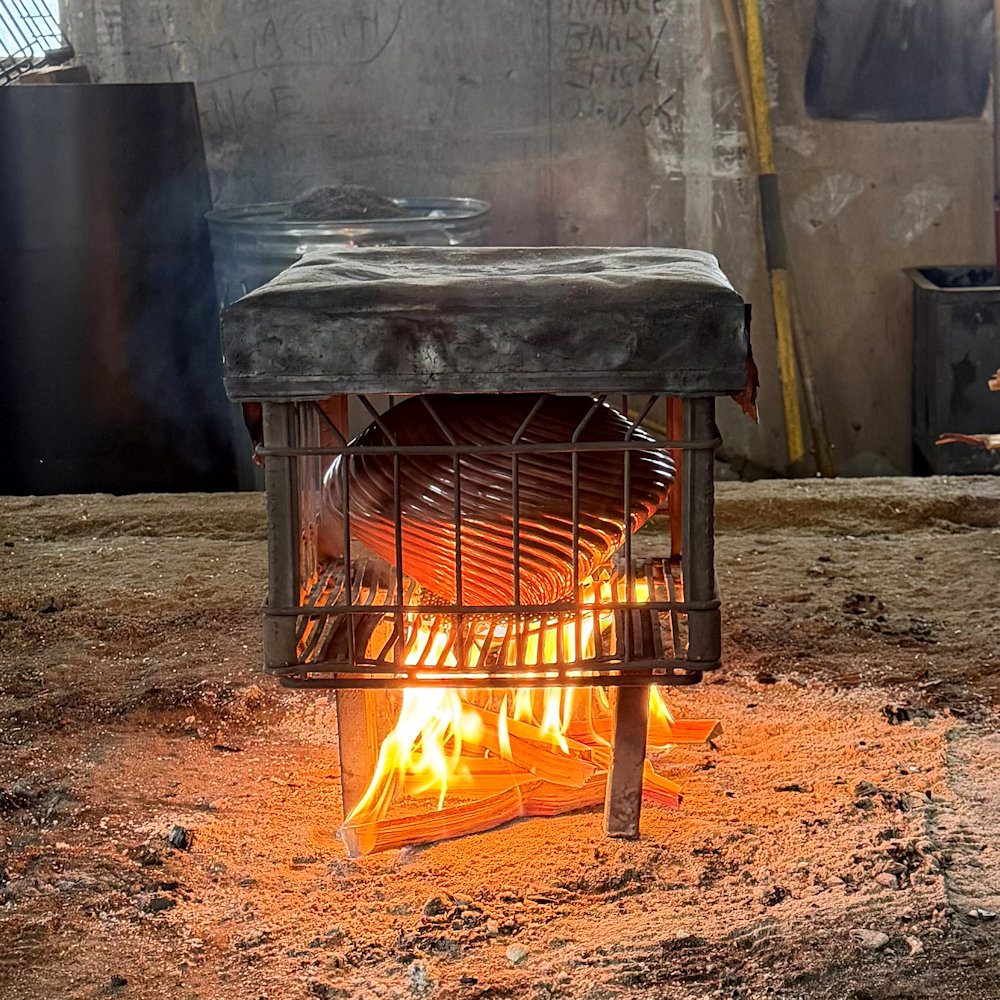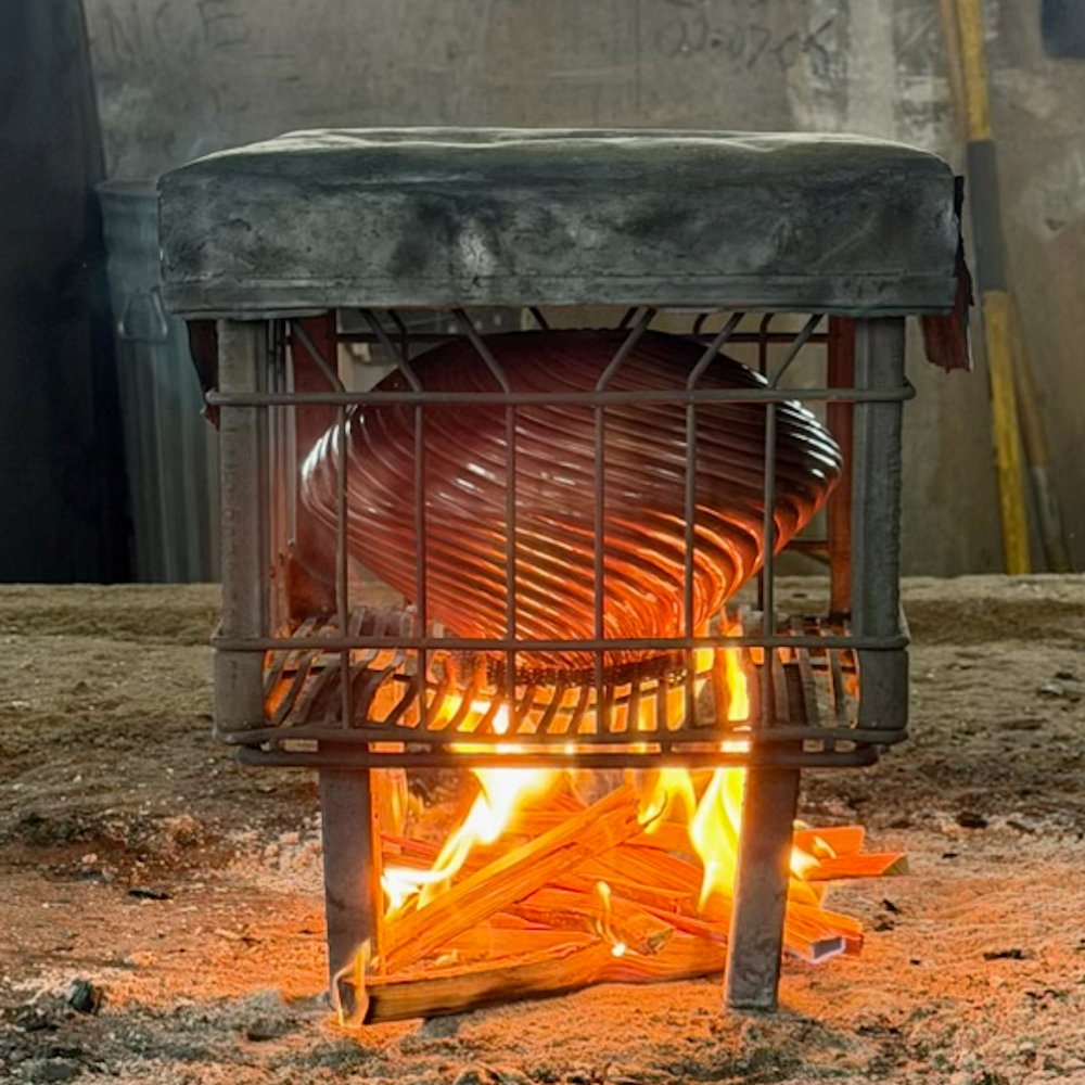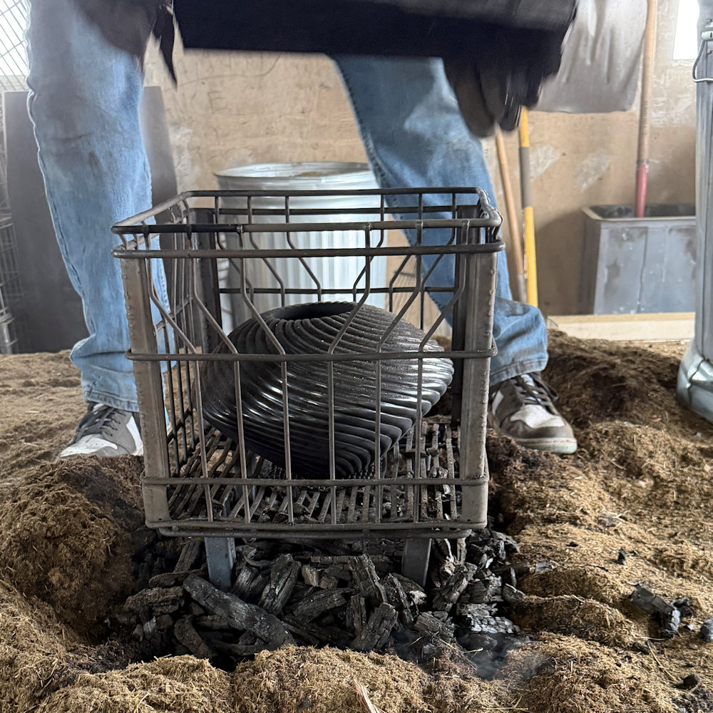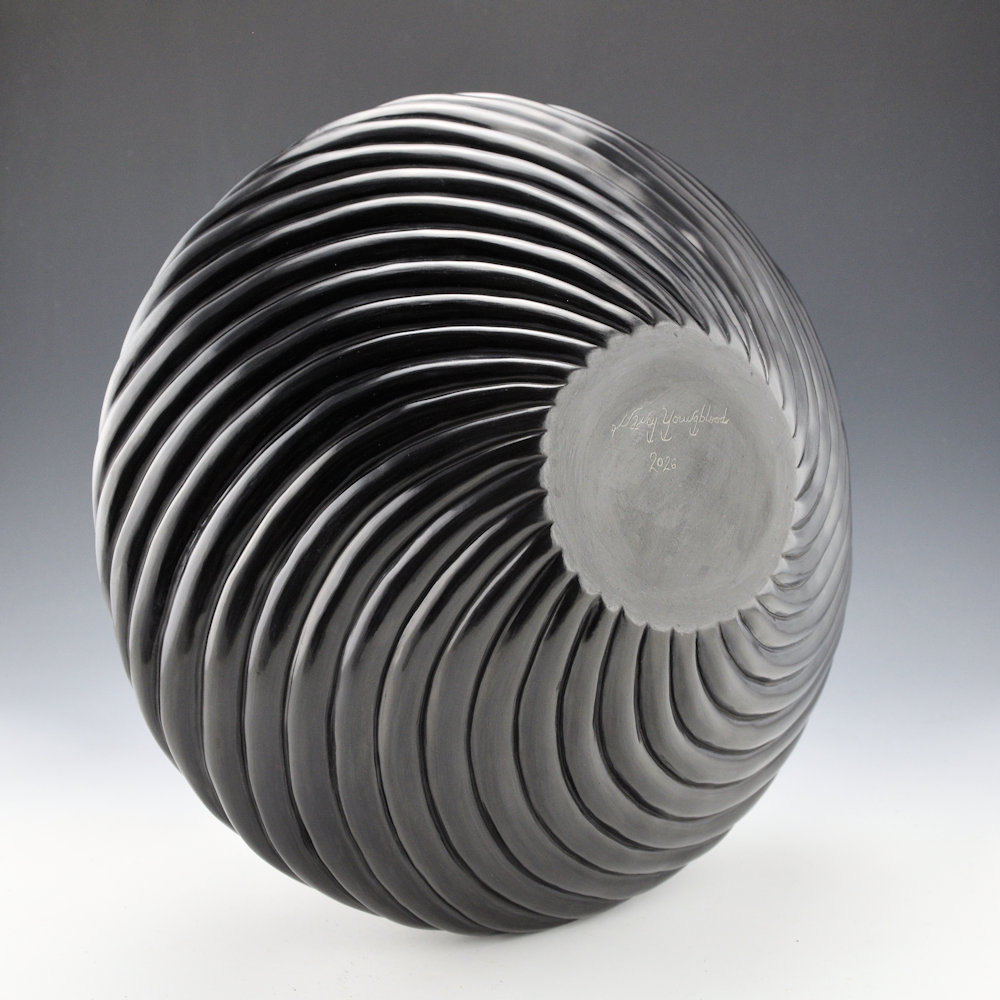 As well, note the depth of the carving on this piece.  To fully polish this piece takes an extraordinary amount of time.  Consider that each rib has two “sides” to be polished and the surface area of the piece is about double its size!  The bowl was traditionally fired a glassy black.  The last photos are ones that she took of the firing process.  The results are stunning with a glassy surface, angled to reflect the light.  Nancy has won numerous awards for her melon bowls and this is undoubtedly iconic of her style.  Most recently, she won the 2018 “Best of Pottery” at the Santa Fe Indian Market.  This bowl is signed on the bottom in the clay, “Nancy Youngblood, 2026”.  A piece of history in clay!