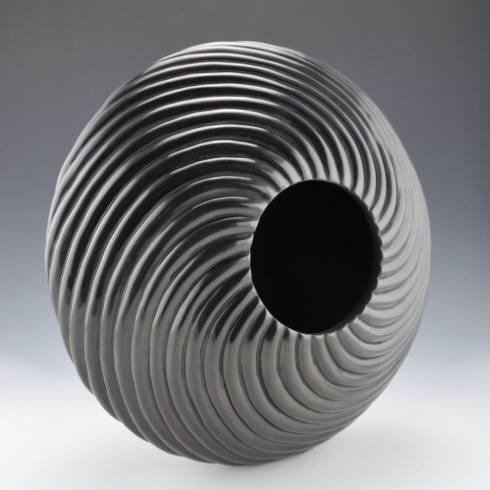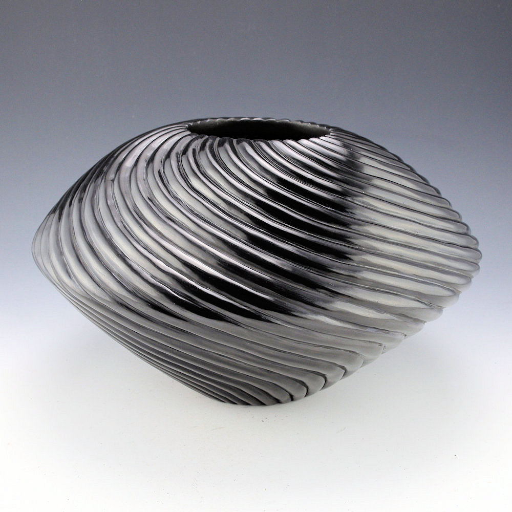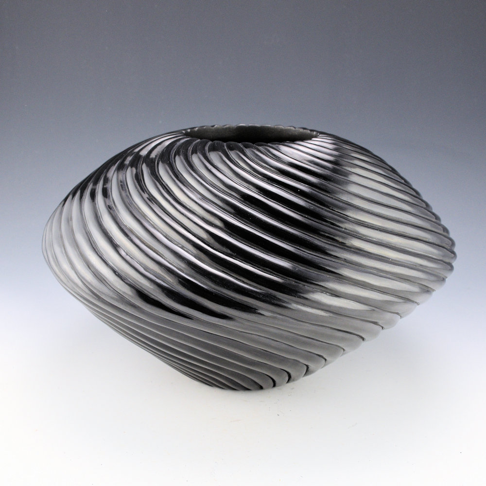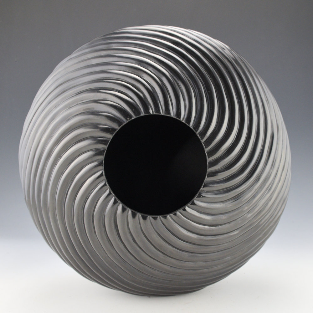 This is a spectacular new swirl melon bowl by Nancy Youngblood.  The bowl is deeply carved with 32 melon ribs that extend from the rim to the base.  Note on the top of the bowl how each rib is delineated and carved to a separate point!  Incredibly, they don’t chip or crack when she is carving or polishing them.  What makes the shape work is that the ribs come to a sharp shoulder, then continue to swirl to the base.  There is a unique optical illusion created in person, making the base seem smaller than it really is!  It almost appears to be floating.  This is an unexpected fluidity and movement and it remains in perfect balance. Thirty-two ribs encircle the piece.  They are carved into the clay, and then each is stone-polished.  Consider that each rib has two “sides” to be polished, and the surface area of the piece is about double its size!   Nancy said of the “slant swirl” style of her pottery:
