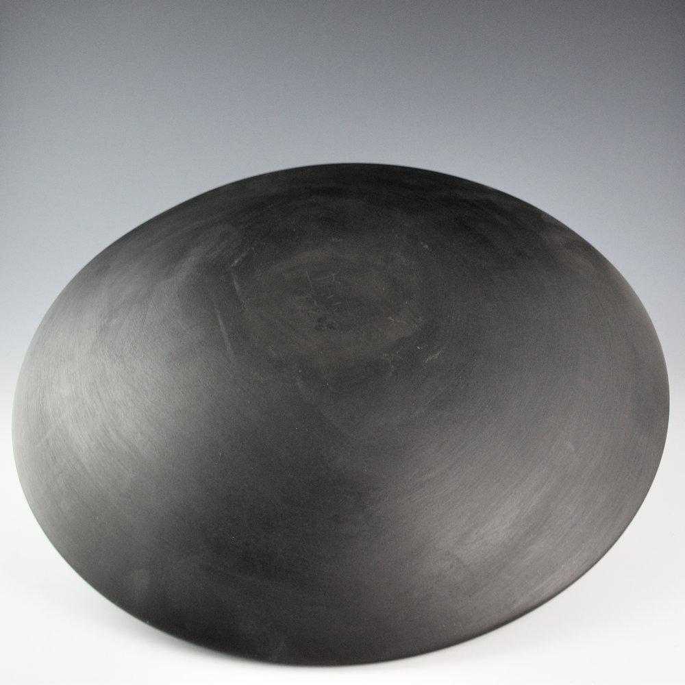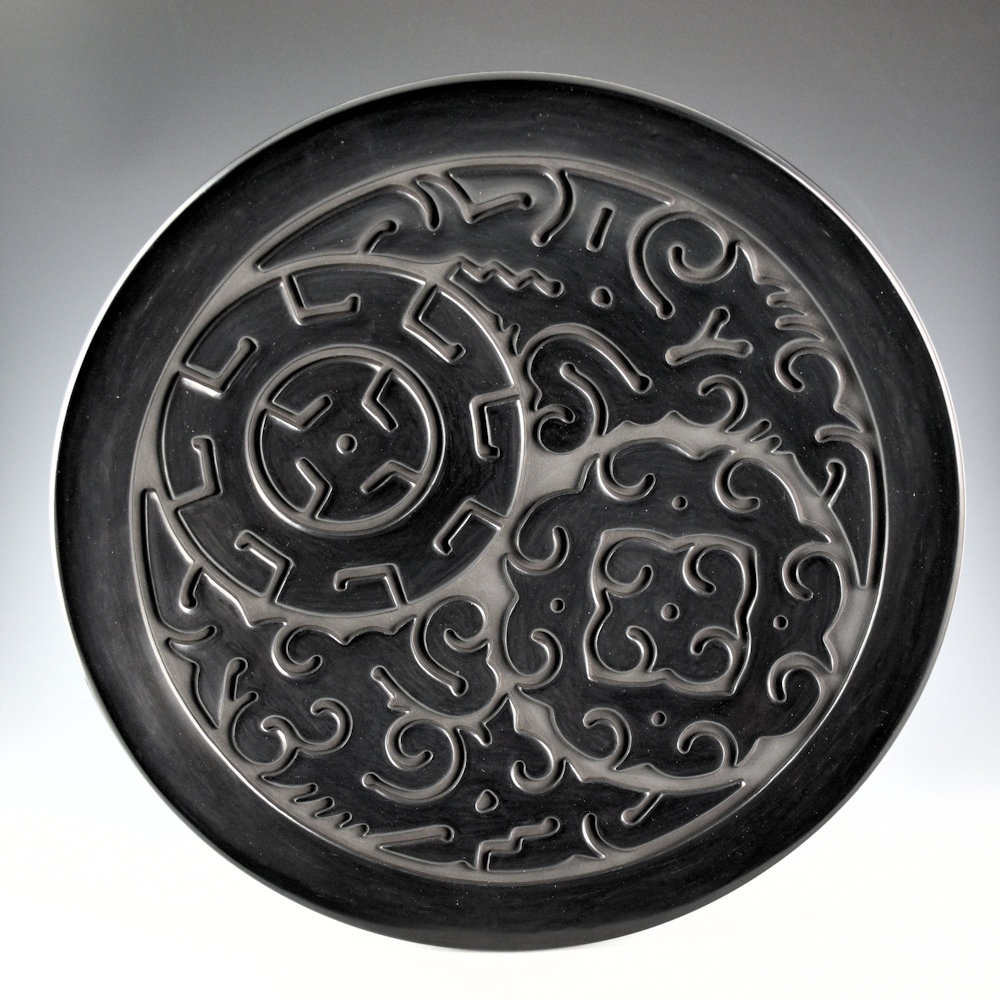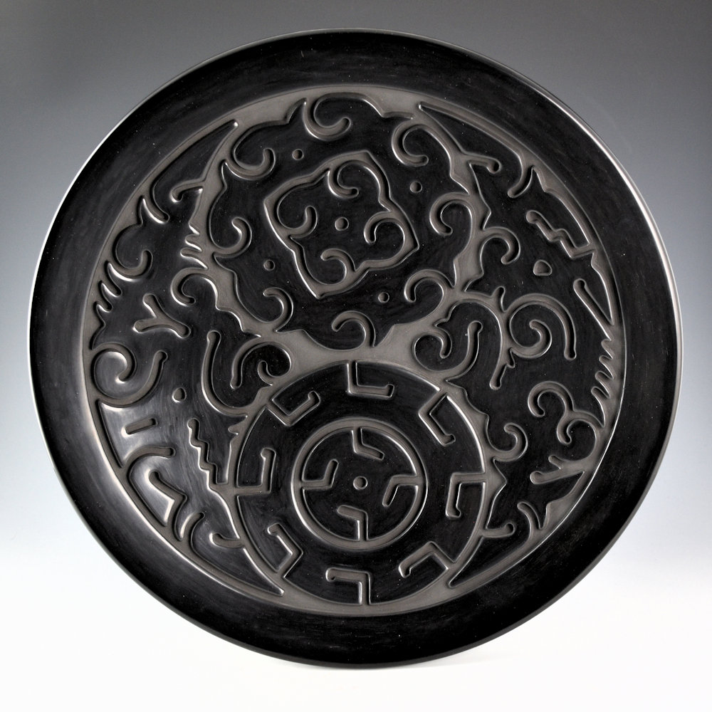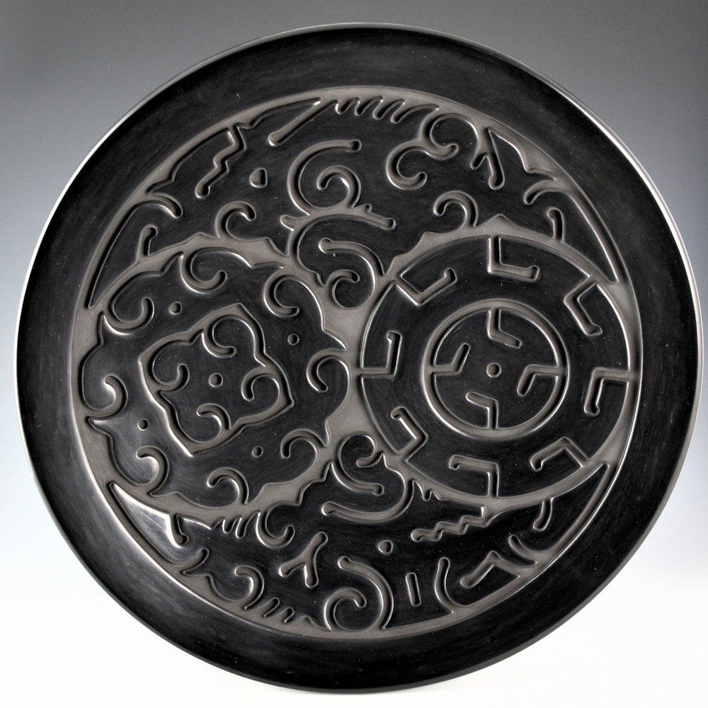 This is a large plate by Nathan Youngblood. It is made from native clay and it is fully carved. The rim of the plate is polished. The center has two medallions. One has walking bear paws and the other spiraling clouds. They are both surrounded by cloud and rain designs. Note the visual contrasting of angular and circular designs. The entire surface is fully polished and the plate was fired a deep black coloration. Nathan’s black pieces often achieve a “water-like” appearance to the polished surface, which gives them their own distinctive shine. The plate is signed on the back with his name and Tewa name hallmark. It is in excellent condition with no chips, cracks, restoration, or repair.