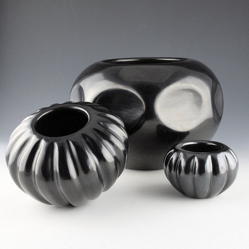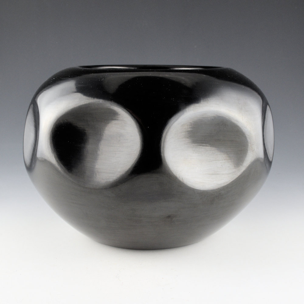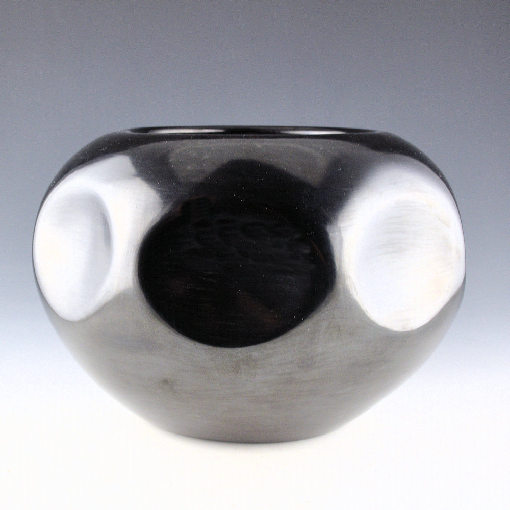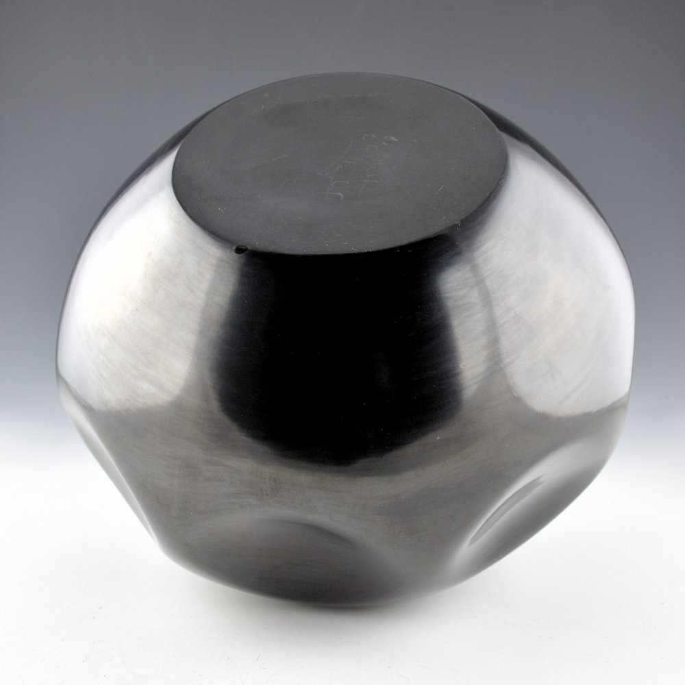 Technically, it is a difficult shape to make as the indentations are pushed into the clay and you want to keep symmetry from one section to the next. The piece is then stone polished and the indentions become like small mirrors, reflecting everything around them and revealing any problems with polishing.  To create a great gourd bowl, the polishing and form must be in sync.  The balance and placement of the gourd indentations work perfeclty on this piece, especially because of its size.   The bowl is very highly polished and fired to a deep black.  It is in excellent condition with no chips, cracks, restoration or repair.  It is signed on the bottom in the clay, “Nathan Youngblood” and his hallmark.