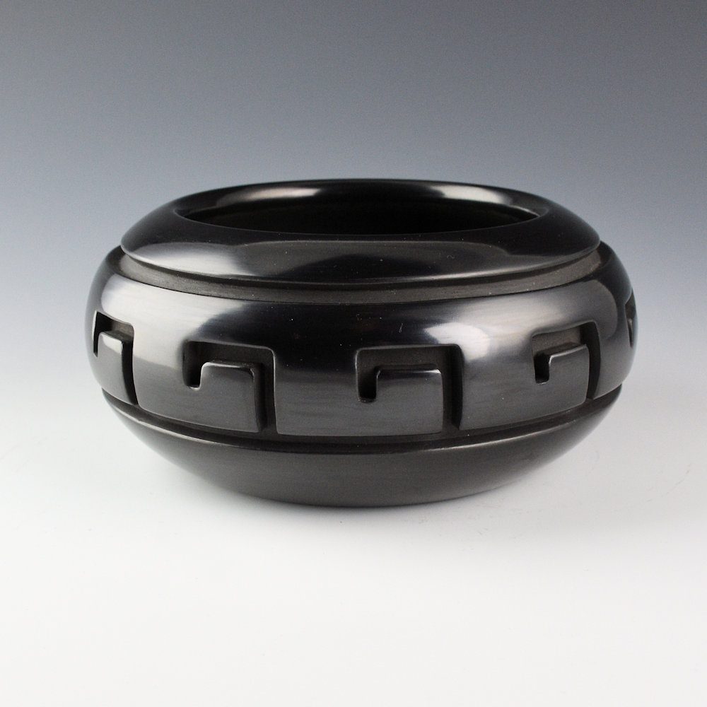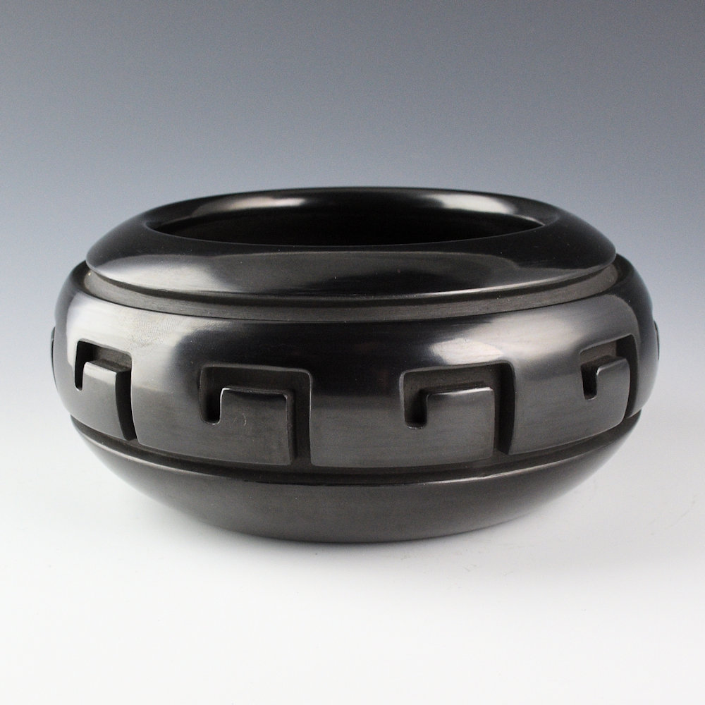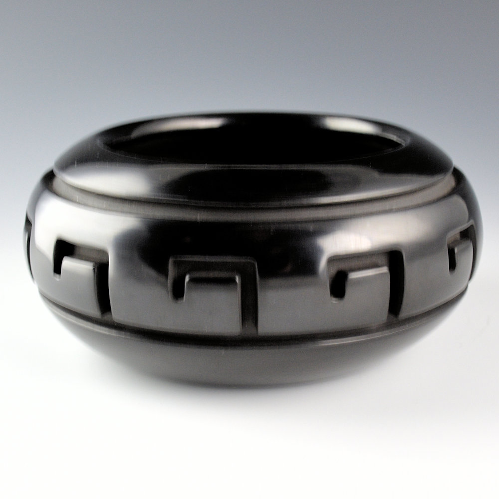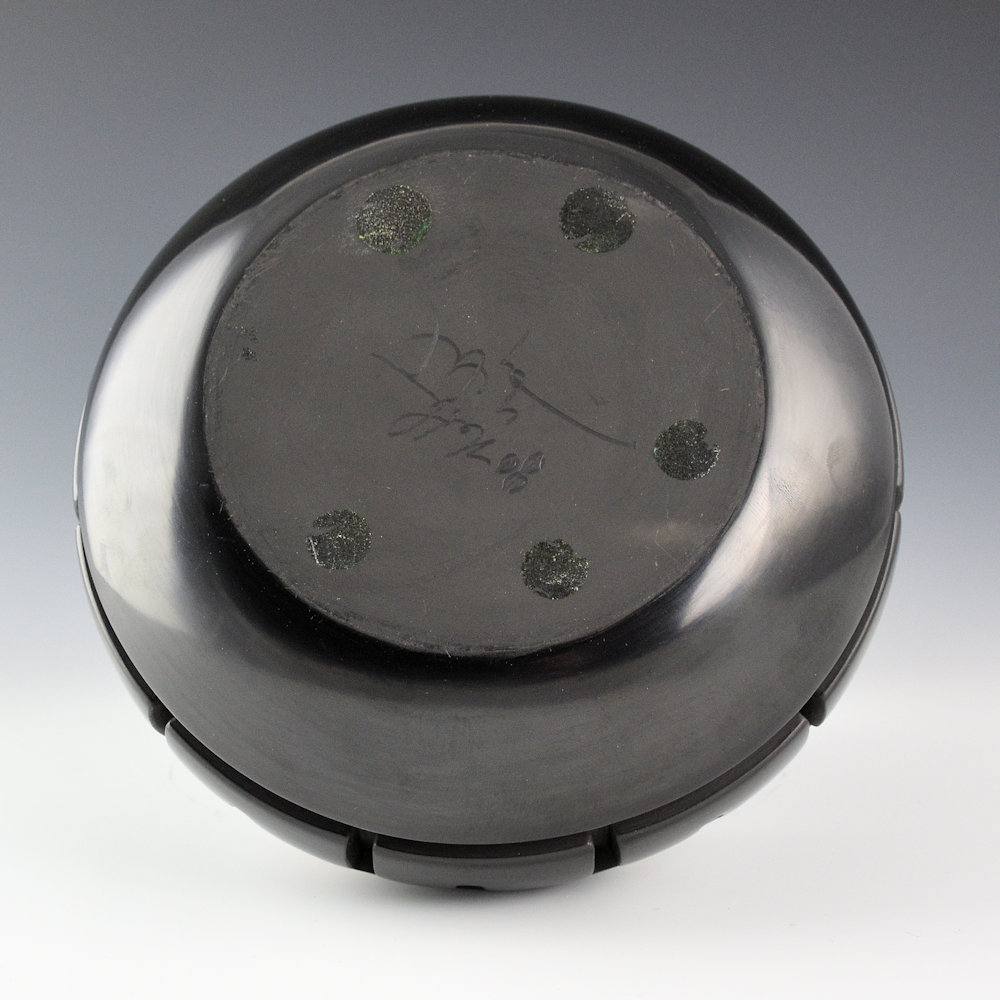 This is a classic bowl by Nathan Youngblood from the 1980s.  The bowl is round in shape and deeply carved  The design is a “walking bear paw”, which encircles the piece.   The design is one which is often seen in the work of Margaret Tafoya and it is meant to represent the path of a bear walking.  The bowl is very highly polished and perfectly fired.  It is in excellent condition with no chips, cracks, restoration or repair.  It is signed on the bottom in the clay, “Nathan Youngblood” and his hallmark.