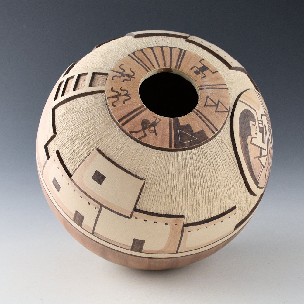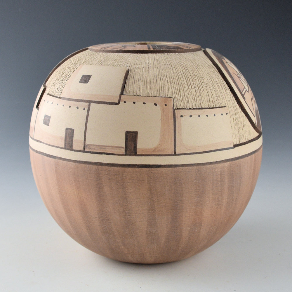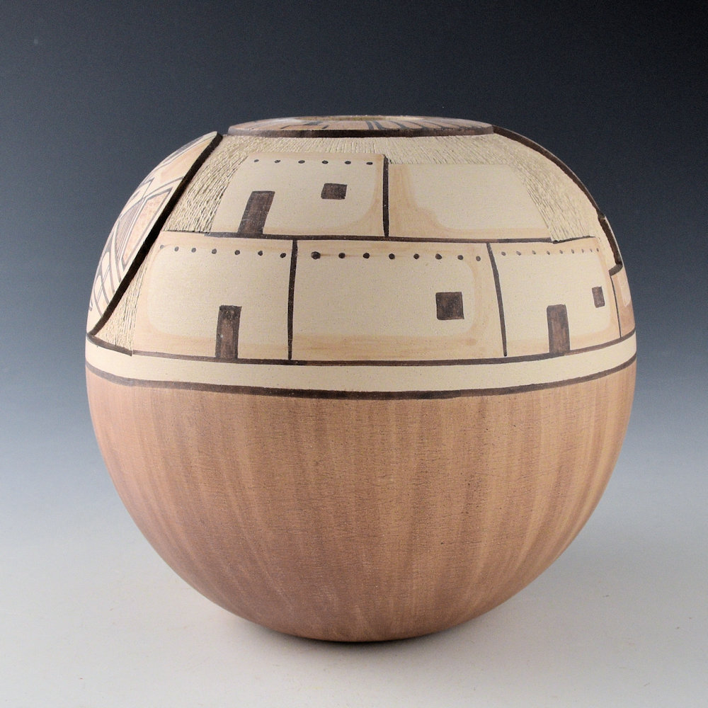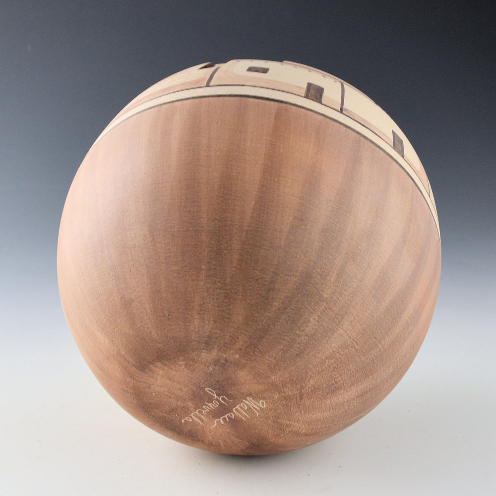 This is a large bowl by Wallace Youvella. He was the husband of noted Hopi-Tewa potter Iris Nampeyo. Wallace was one of the first three men at Hopi in the mid-1970’s to begin making pottery (the others were Mark Tahbo and Thomas Polacca). Interestingly, Thomas and Wallace (who were brothers-in-law) both started with traditional Hopi-Tewa designs but met resistance from the women potters, so began making pieces that were either fully polished and etched or carved. This bowl has a kiva and ladder on one side. The kiva leads up to the rim of the bowl, which is painted with corn, flute player, feathers, and a petroglyph person. The opposite side has a single human figure as part of the “emergence” story. Separating them are Hopi “pueblo” style buildings. each design is carved into the clay and painted with clay slips, and the piece has the appearance of wood. It is an exceptional piece of his pottery with creative designs and tight painting. This piece is signed on the bottom in the clay, “Wallace Youvella”. It is in excellent condition with no chips, cracks, restoration or repair.