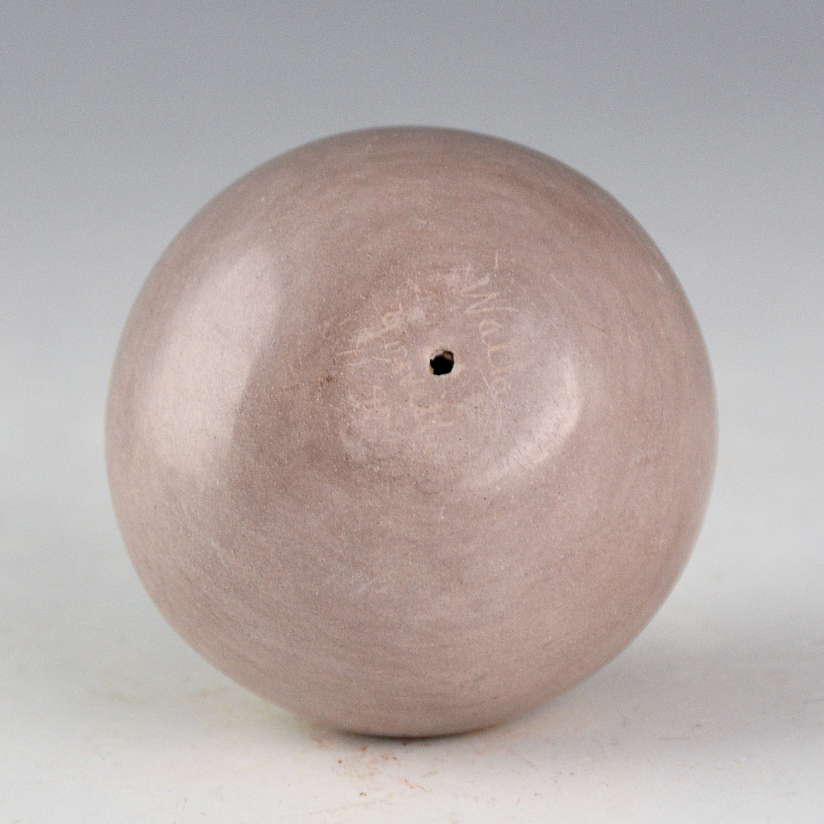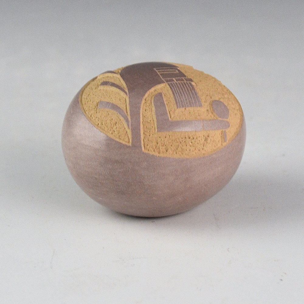 This is an unusual seedpot by Wallace Youvella, the husband of Iris Nampeyo It is coil-built and fully polished with a mavue clay slip, which has a very purple coloration. We have had his pieces in red, natural clay, and even blue, but this is the first one we have had that was mauve. It is etched with a Longhair Katsina on the top. Wallace was one of the first three men at Hopi in the mid-1970’s to begin making pottery (the others were Mark Tahbo and Thomas Polacca). Interestingly, Thomas and Wallace (who were brothers-in-law) both started with traditional Hopi-Tewa designs but met resistance from the women potters, so began making pieces which were either fully polished and etched, or carved. This piece is signed on the bottom, “Wallace Youvella”. It is in excellent condition with no chips, cracks, restoration or repair.