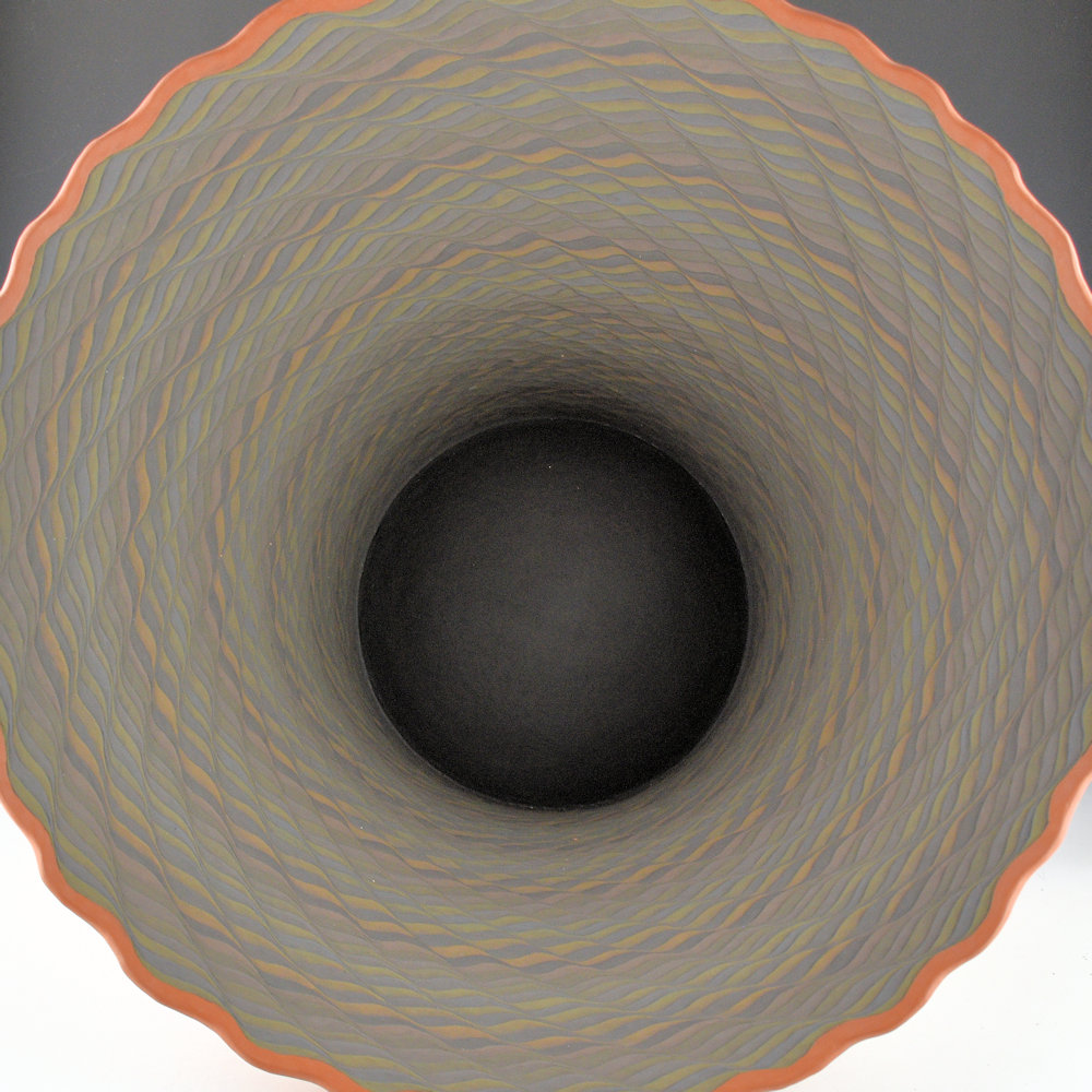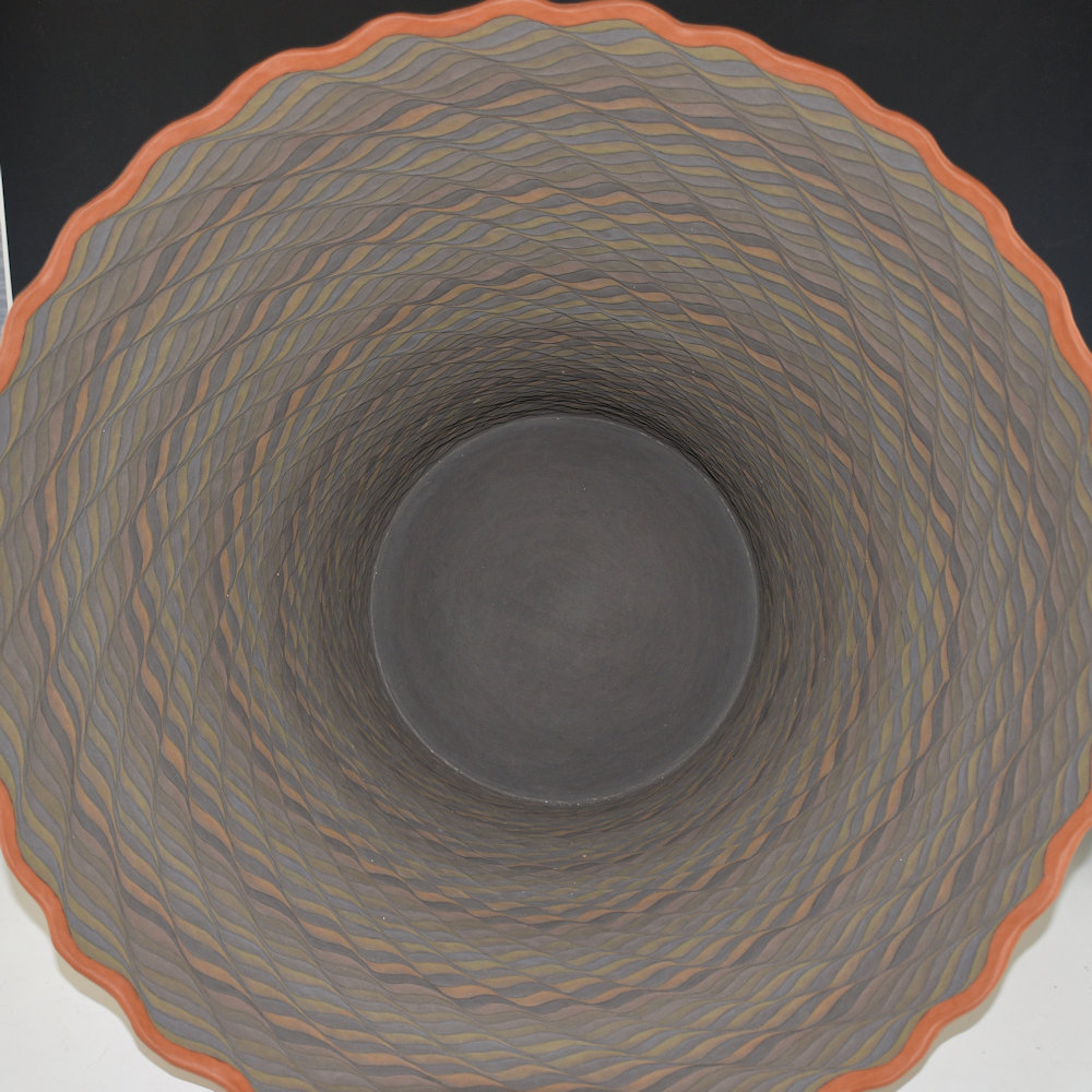 This is a spectacular large ajr by Richard Zane Smith at the height of his “op-art” period in the 1990s. The jar is coil-built with the coils left exposed on the exterior. The coils are then incised to create the designs and various colors of clay are added. The outside of the jar has horizontal coils and is etched with a ribbon design. However, it is the interior that is amazing! It has swirling, overlapping rows of corrugation. The coloration is striking both inside and outside. What makes this jar so special is that you look at it and wonder how he could have created a piece with two different directions and styles of coils! It is visually and technically amazing! The rim of the jar is stone-polished in contrast to the matte designs. All the colors were applied before the piece was fired. It is signed, “Richard Zane Smith” and dated 1996. It is in excellent condition with no chips, cracks, restoration or repair.