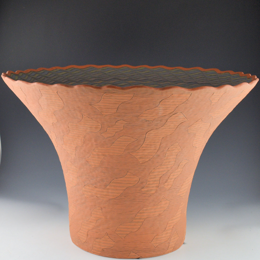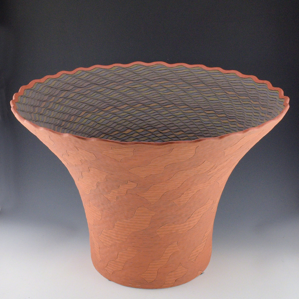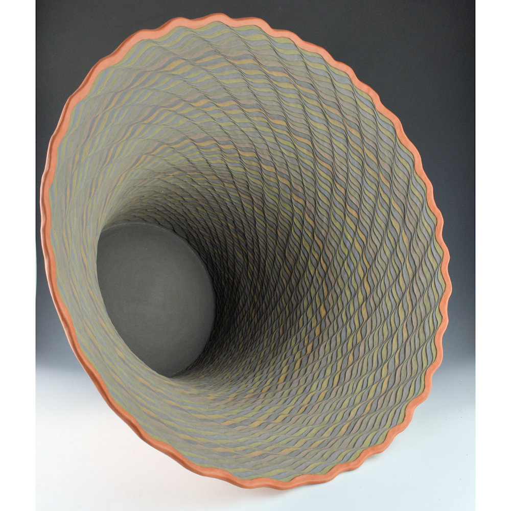 “The 1980s was a period of encouraged experimentation where an artist could work with one foot in traditional ways and traditional roots and the other out there probing into the future. A fascinating era of arts rooted in tradition but also expanding all over. When there seemed to be some interest I thought I’d start by keeping close to the old pueblo style of corrugated pottery. I started doing some imitation work but inevitably kept adding my own thing. In the beginning, they were just the clay color and I was doing design indention with my fingernail. Then I thought I would add another clay color, so I started adding slip and painting certain areas. Then, why not two clay colors? It wasn’t long and I started seeing that I could develop 3-D patterns. I could mix my slips in graduating shades. Once that happened it opened the door, and everything was 3-D. First, they were geometric, and then it was curvy geometric shapes which became a signature for years.” Richard Zane Smith, Spoken Through Clay