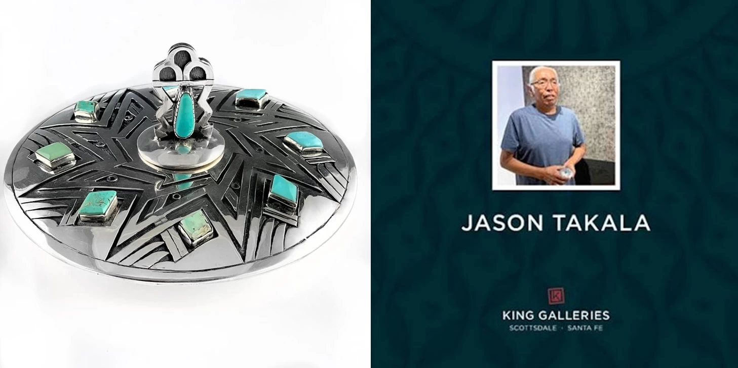 Jason Takala (Hopi)Jason Takala (Hopi) has long been one of the most sought-after Hopi jewelers, creating the classic double overlay. Each piece is creatively designed, cut out of sterling silver or gold, and soldered to the second piece of silver. As long as I have known Jason, he has been fascinated with making “pottery” in silver. |